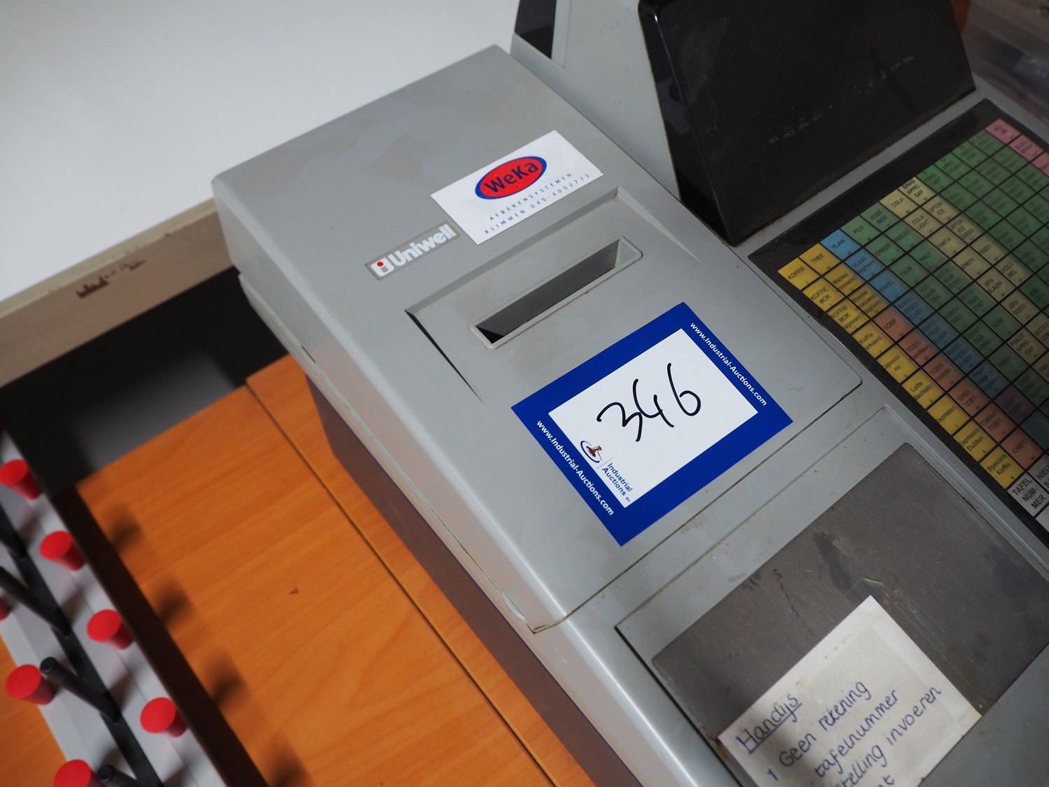 Uniwell cash register with receipt printer, dimensions: 450 mm x 420 mm x 340 mm. Technical condition unknown.