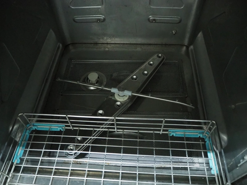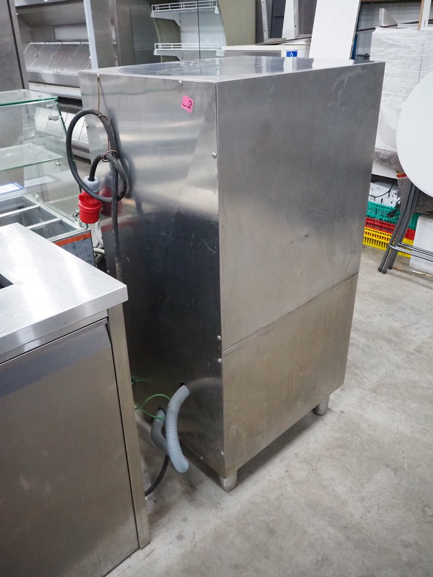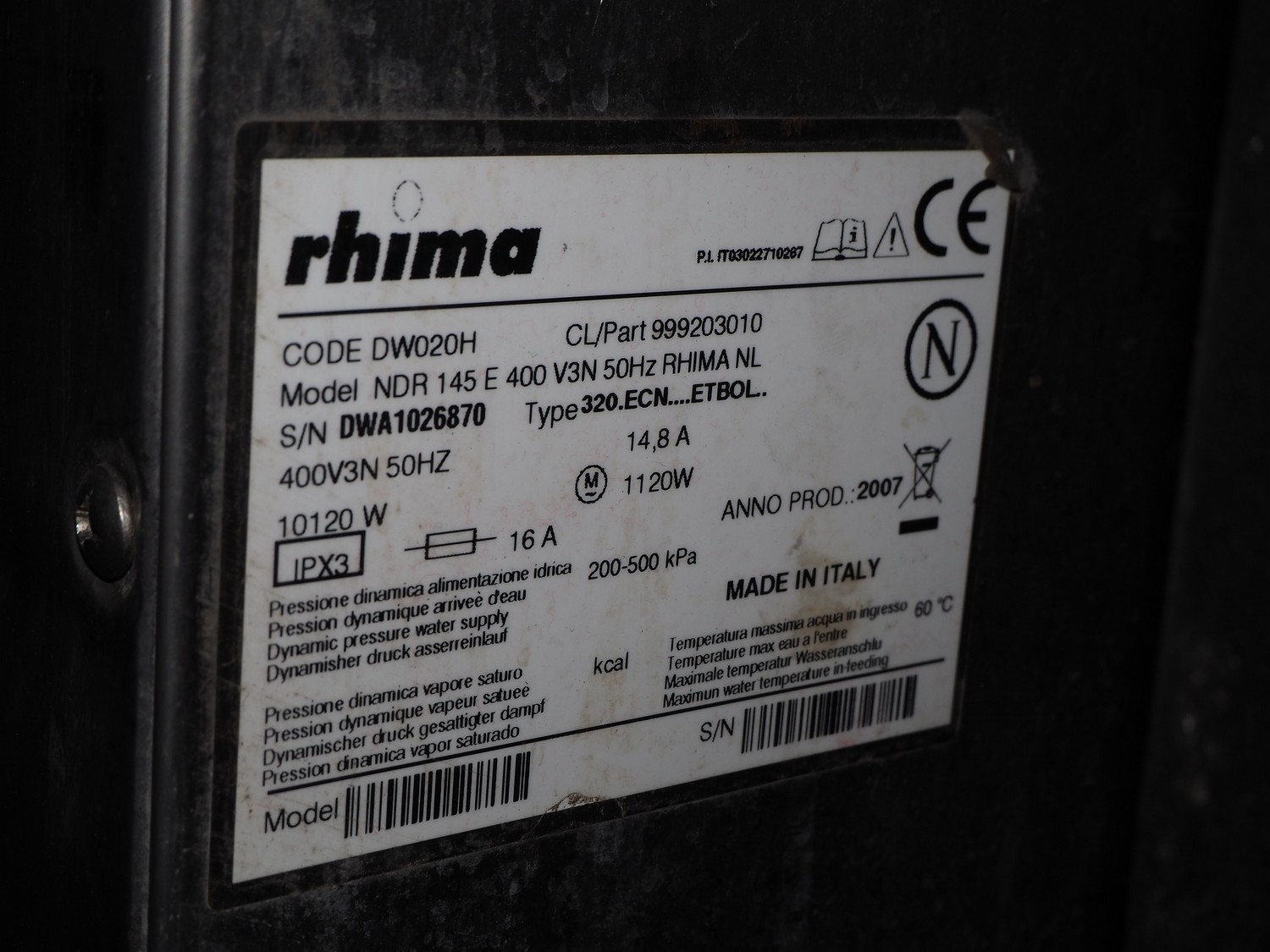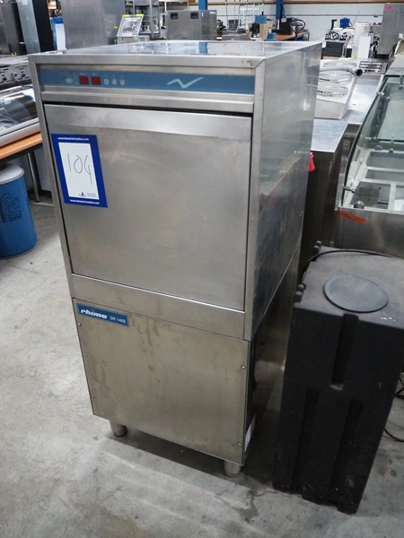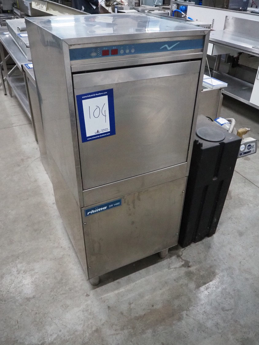 Rhima dishwasher, model: NDR 145 E, serial number: DWA1026870, 400 V, 3 Ph, 50 Hz, 14.8 kW, dimensions: 780 mm x 600 mm x 1395 mm.