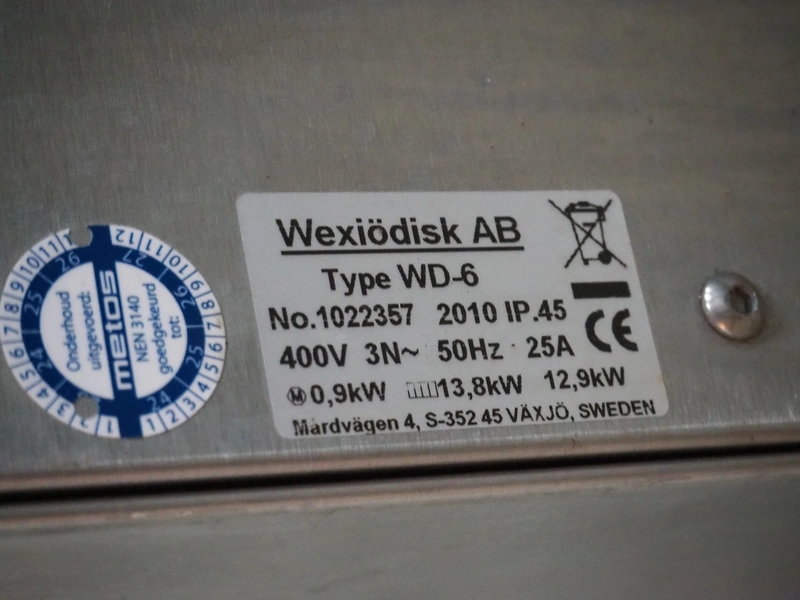 Wexiödisk AB dishwasher, type: WD-6, number: 1022357, year of construction: 2010, 400 V, 3 Ph, 50 Hz, 25 A, 13.8 kW, dimensions: 740 mm x 690 mm x 1420 mm.