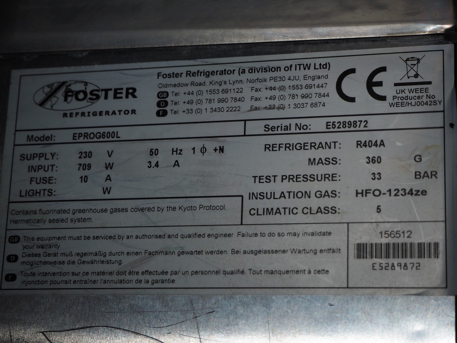 Foster mobile freezer, model: EPROG600L, serial number: E5289872, 230 V, 1 Ph, 50 Hz, 3.4 A, 709 W, refrigerant: R404a/360, 4 racks, dimensions racks: (4x) 650 mm x 530 mm, total dimensions: 800 mm x 720 mm x 2060 mm.