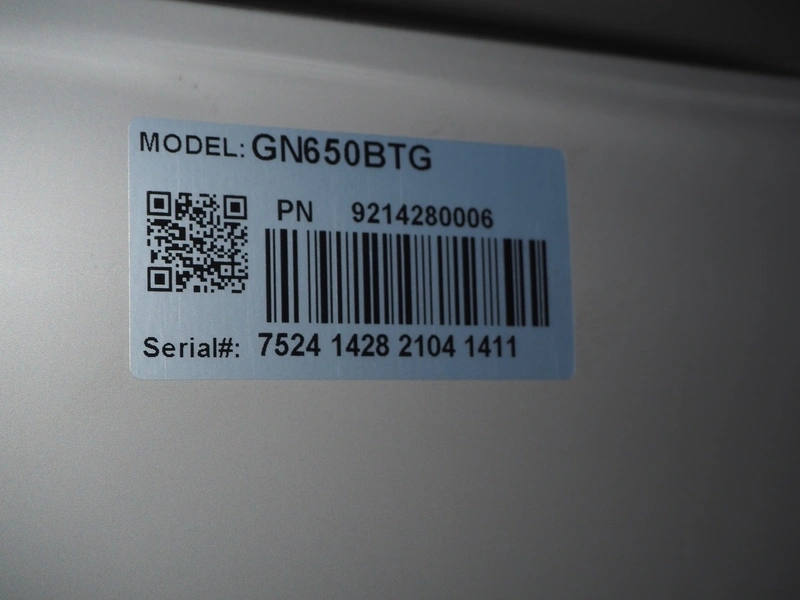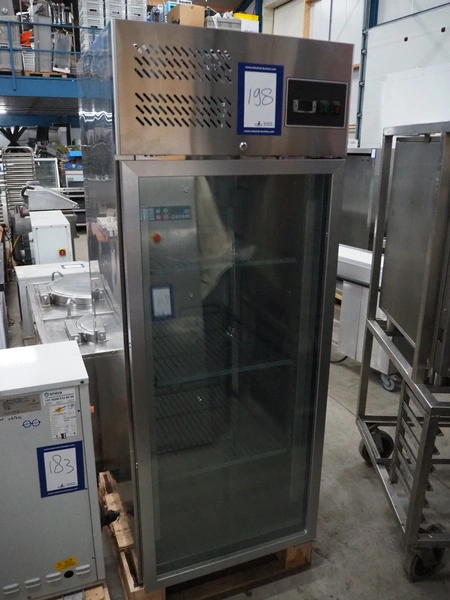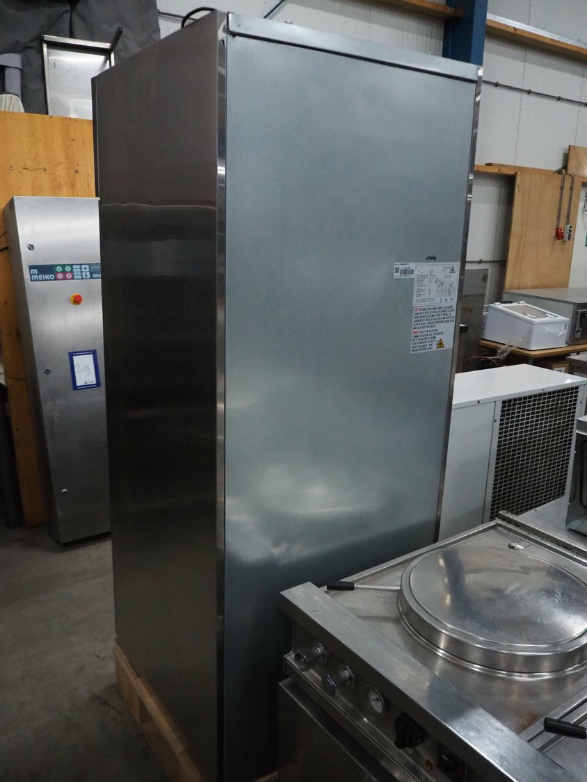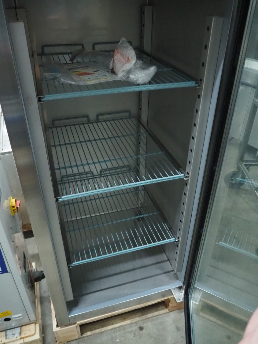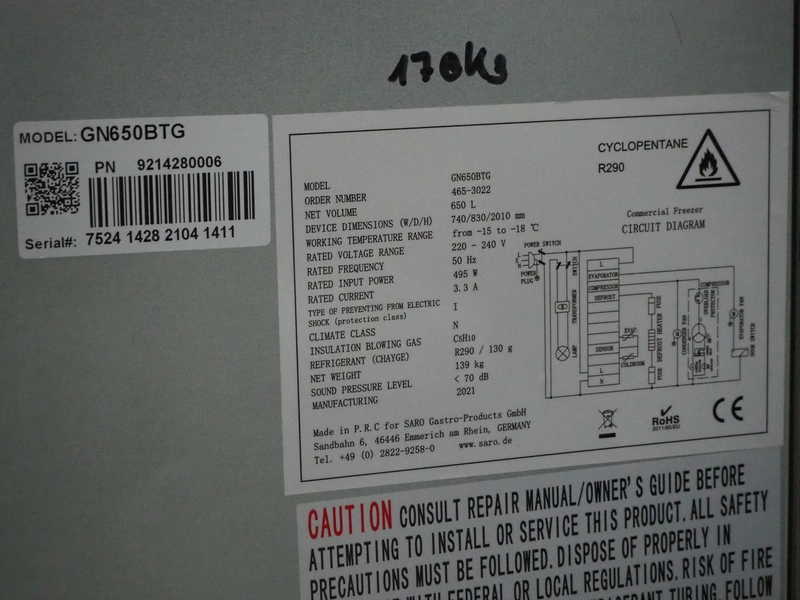 Saro freezer model: GN650BTG, year of construction: 2021, 220-240 V, 50 Hz, 3.3 A, 495 W, refrigerant: R290/130g, 3 racks, dimensions racks: (3x) 640 mm x 510 mm, total dimensions: 830 mm x 740 mm x 1870 mm.