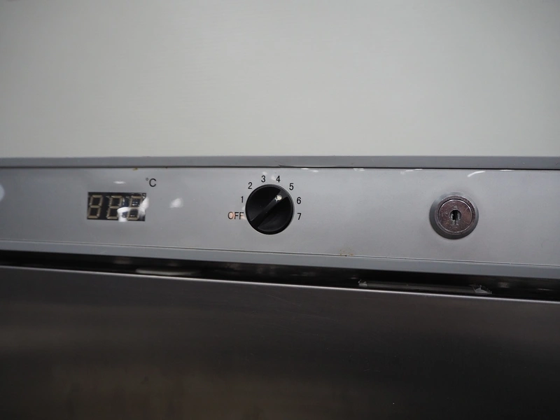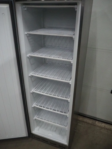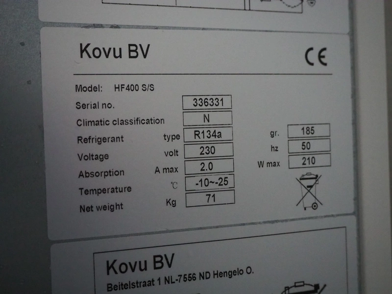 Kovu BV freezer, model: HF400 S/S, serial number: 336331, 230 V, 50 Hz, 2.0 A, refrigerant: R134a / 185 gram, weight: 71 kg, 6 floors, floor dimensions: 400 mm x 450 mm, total dimensions: 580 mm x 600 mm x 1850 mm.