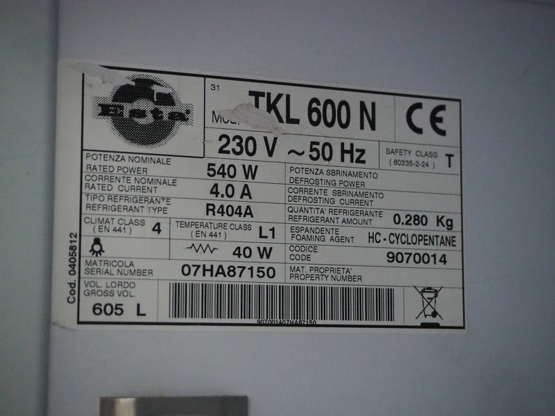 Esta freezer, model: TKL 600 N, serial number: 07HA87150, 230 V, 50 Hz, refrigerant: R404a/0.280 g, volume: 605 litres, dimensions: 870 mm x 665 mm x 1960 mm.