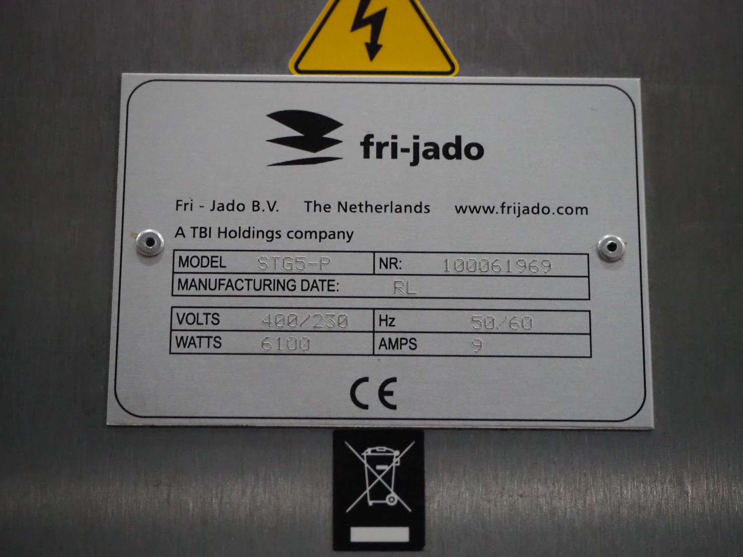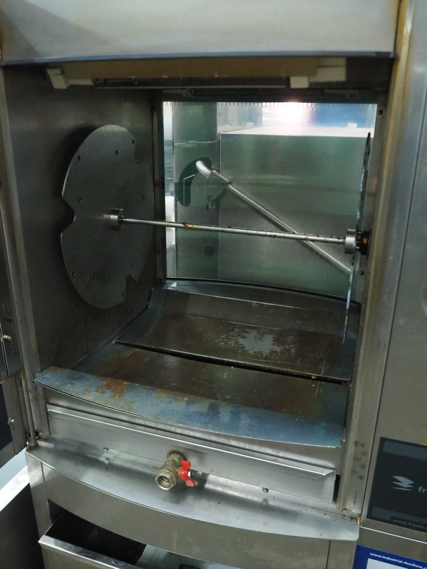 Fri-Jado B.V. rotisserie grill, model: STG5-P, number: 100061969, 400/230 V, 50/60 Hz, 9 A, 6100 W, dimensions: 650 mm x 850 mm x 1750 mm.