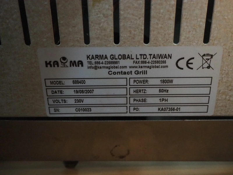 Karma Global Ltd grill, model: 688400, serial number: C010023, year of construction: 19/08/2007, 230 V, 1 Ph, 50 Hz, 1800 W, dimensions: 370 mm x 300 mm x 210 mm.