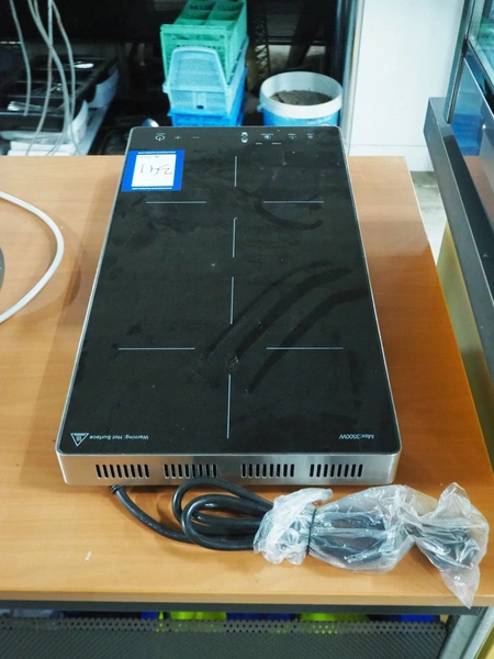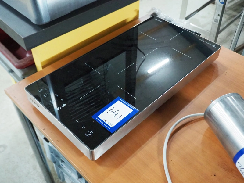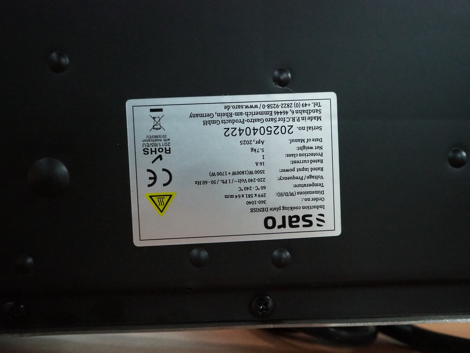 Saro Gastro-Products GmbH induction cooking plate, model: Denise, serial number: 2025040422, year of construction: 04-2025, 220-240 V, 1 Ph, 50-60 Hz, 16 A, 3500 W, weight: 5.7 kg, dimensions: 580 mm x 300 mm x 60 mm.