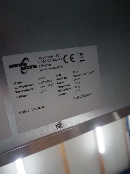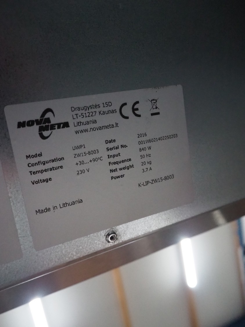 Novameta drop-in heated plate, model: UWP1, serial number: 001W6021402250203, year of construction: 2016, 230 V, 50 Hz, 3.7 A, 840 W, temperature range: 30-90°C, dimensions: 535 mm x 1310 mm x 215 mm.