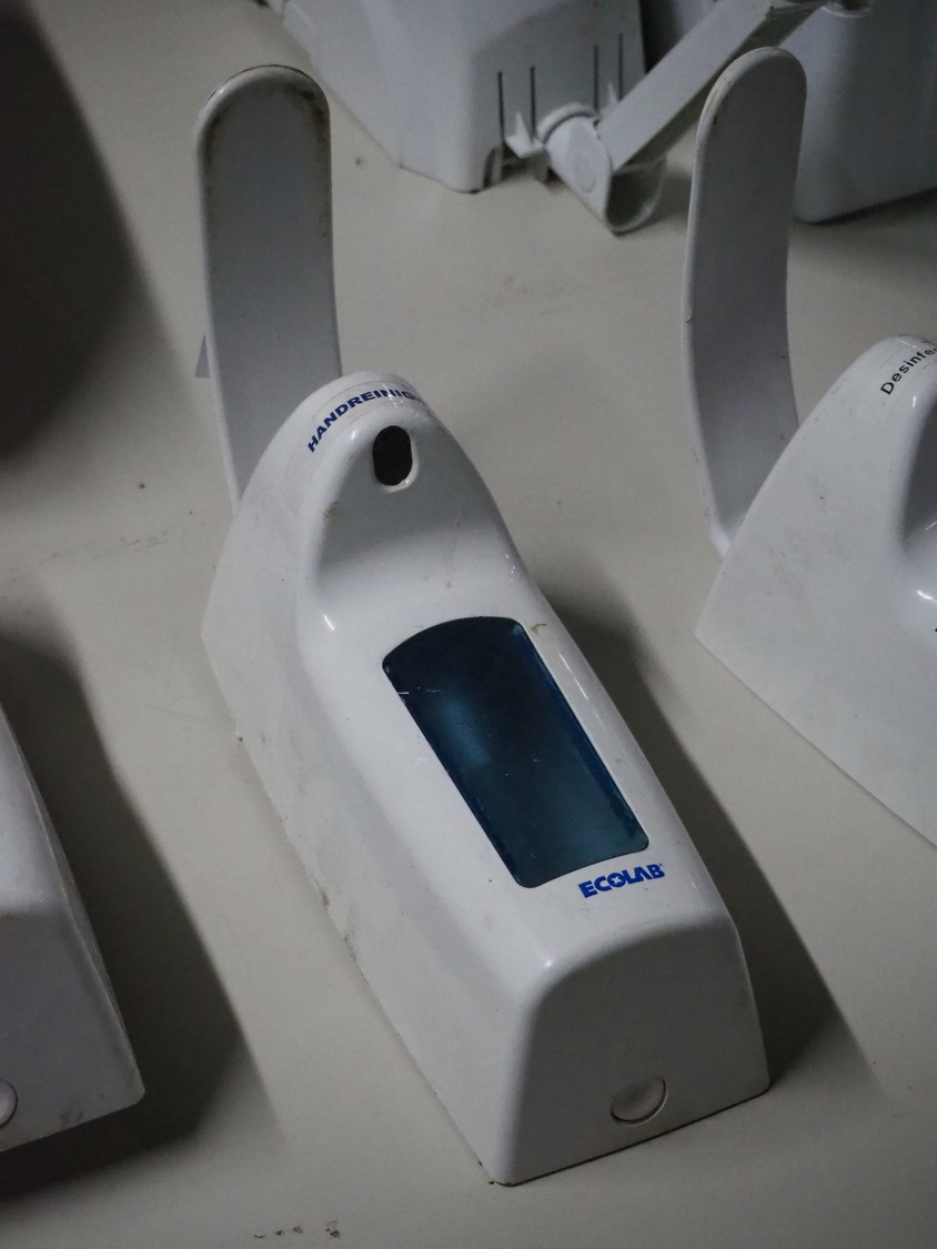 6 soap dispensers, dimensions: (6x) 250 mm x 100 mm x 180 mm.