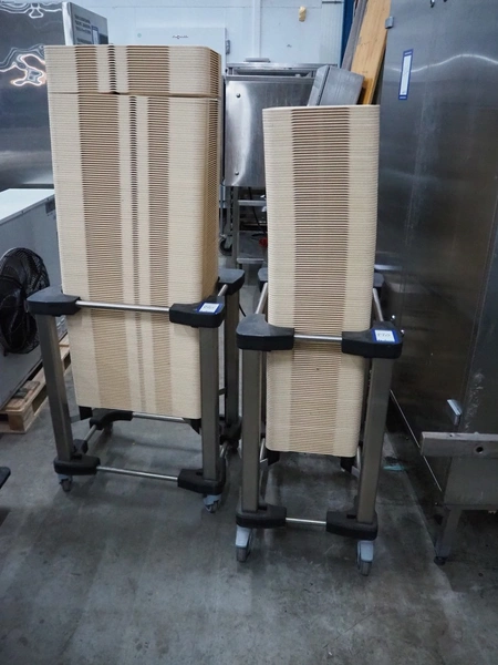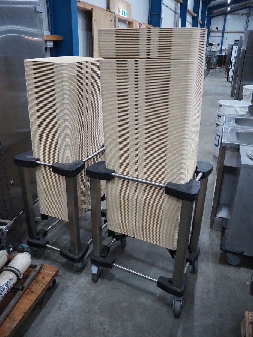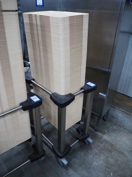 2 trolleys with approximately: 300 plastic plates, plate dimensions: 530 mm x 320 mm, trolley dimensions: 720 mm x 510 mm x 840 mm.