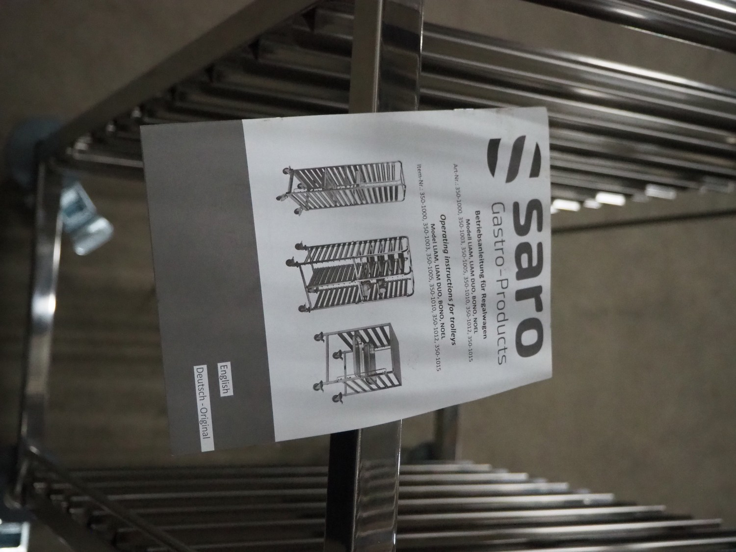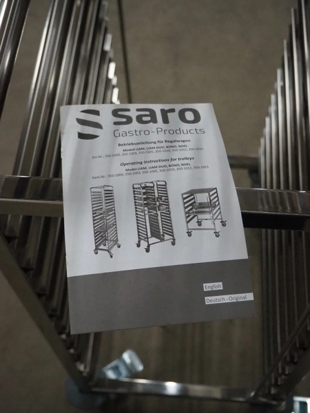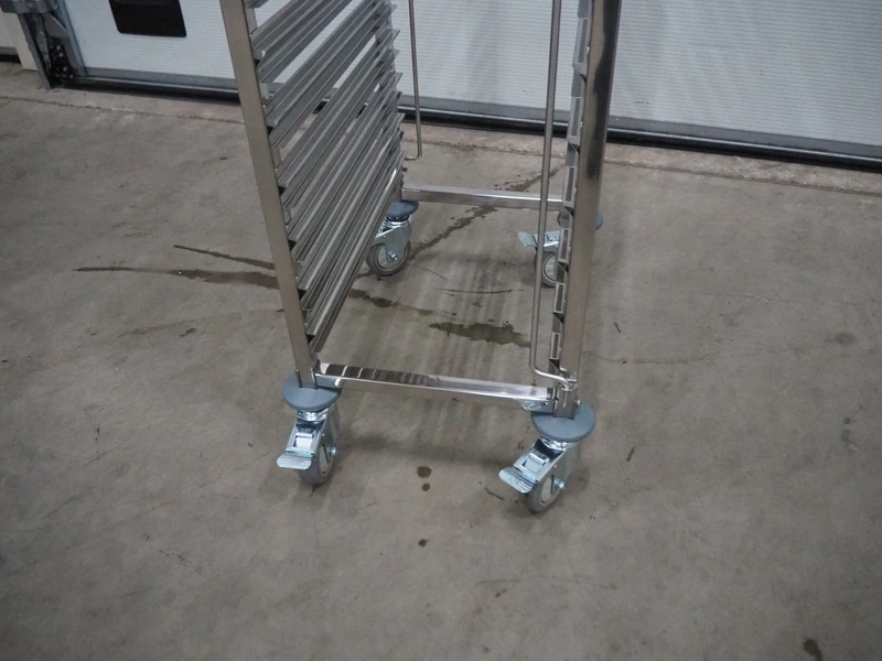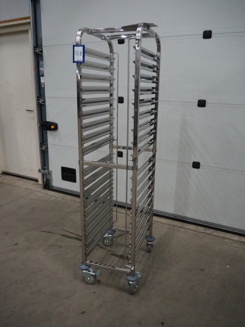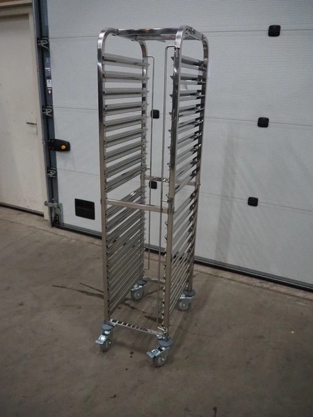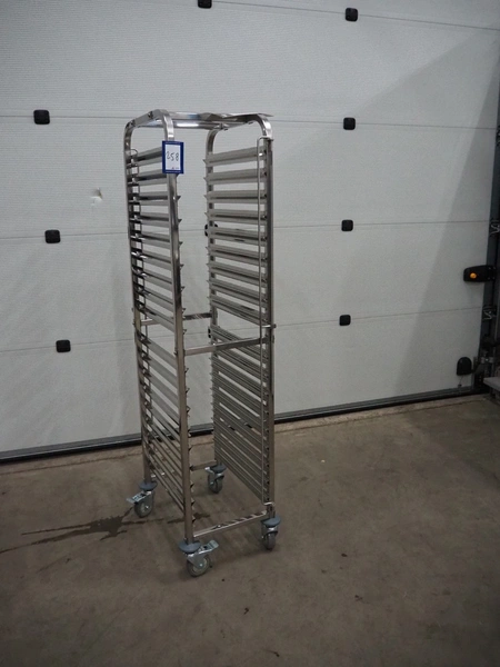 S/s trolley for plates, 32 floors, floor dimensions: 540 mm x 330 mm, total dimensions: 580 mm x 390 mm x 1730 mm.