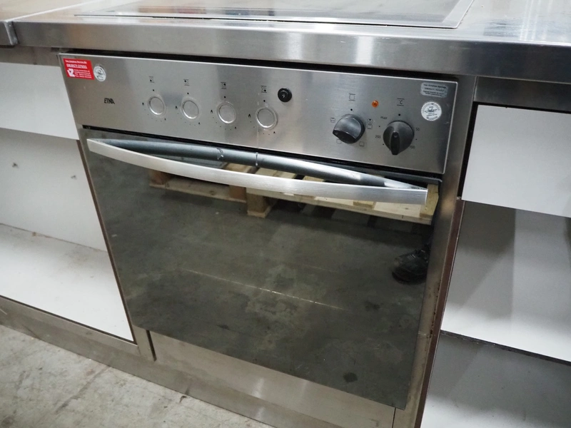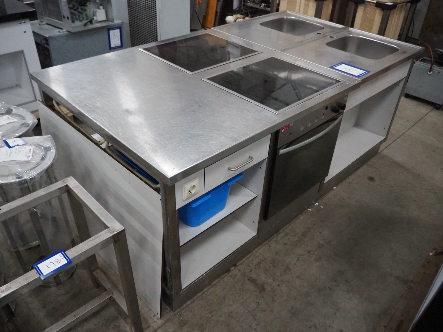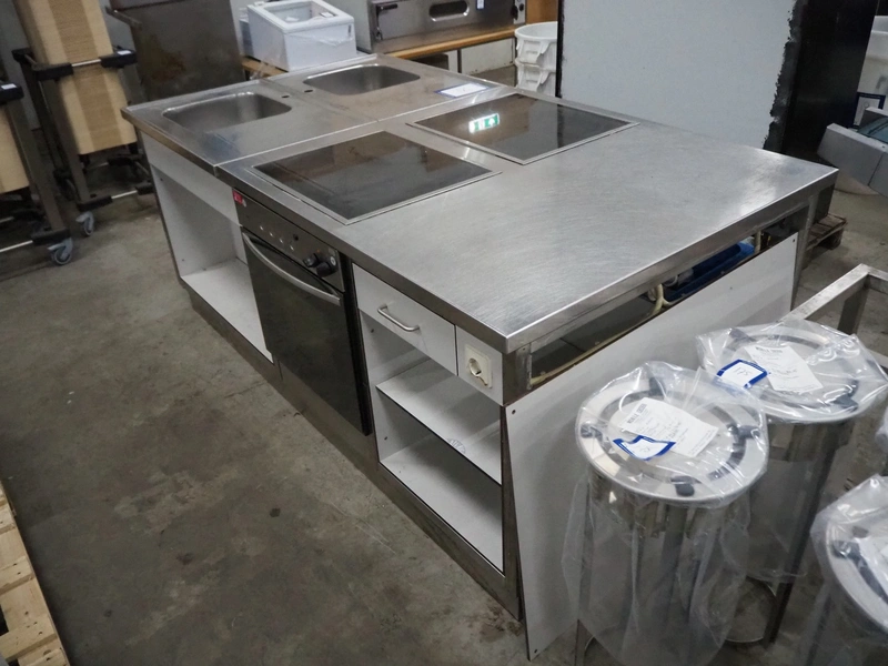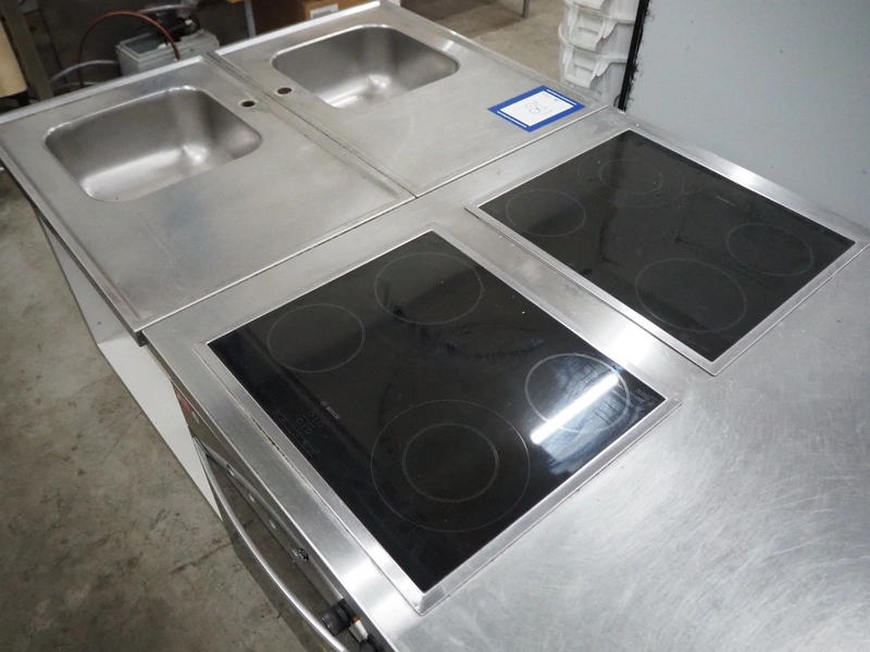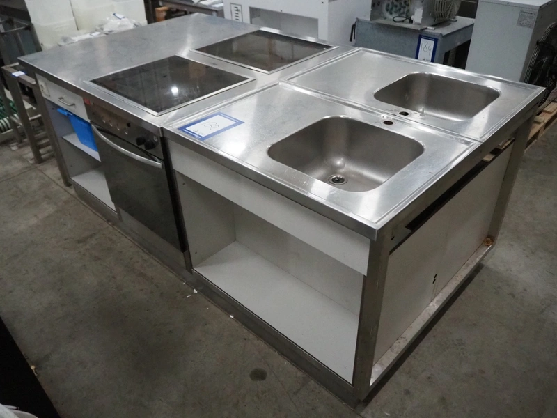 Kitchen counter with 2 induction stoves, (2x) 4-pits, 2 Etna ovens and 2 sinks, dimensions: 1200 mm x 2200 mm x 905 mm.