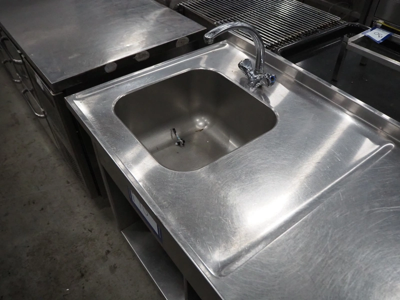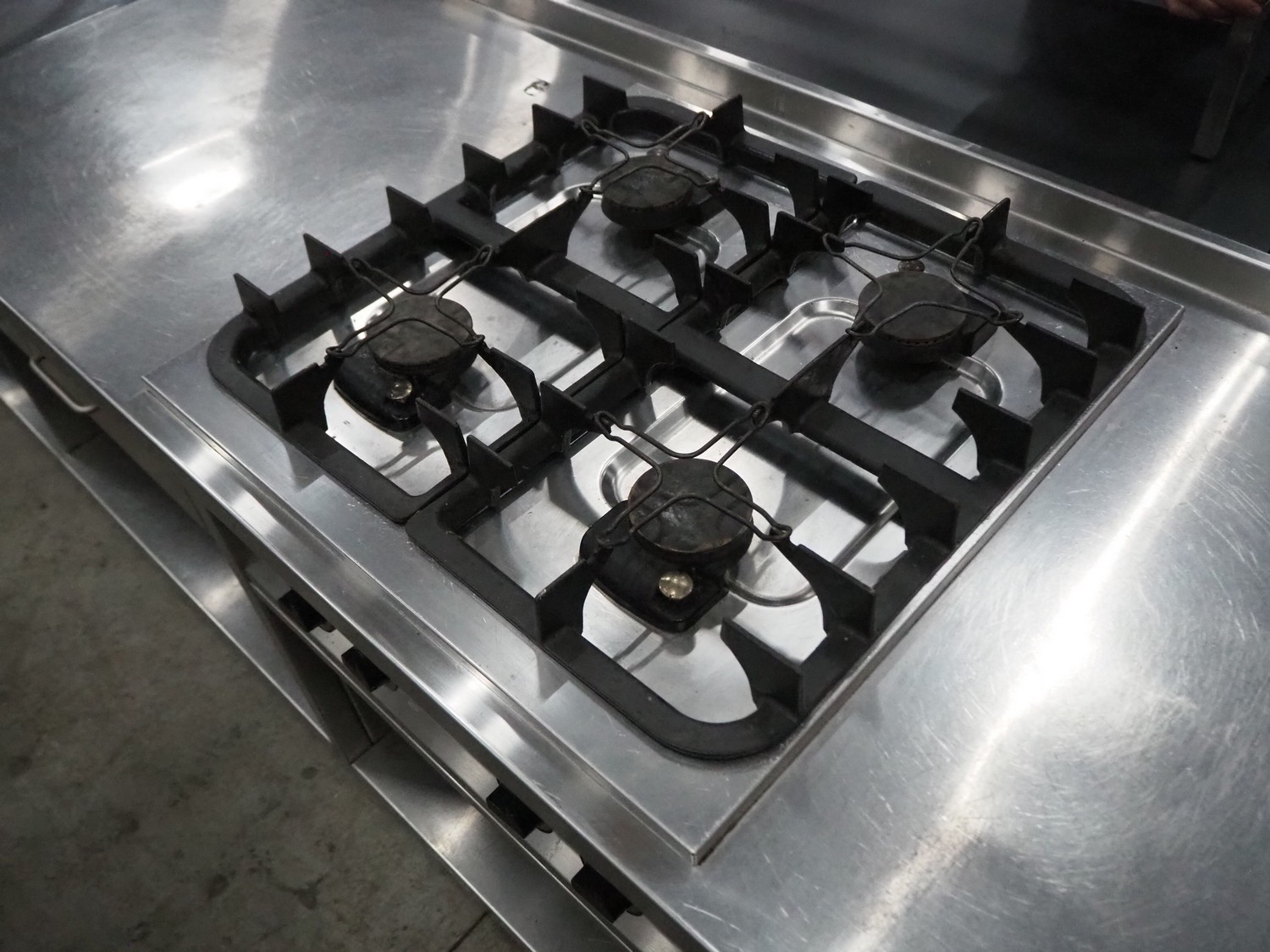 S/s kitchen counter with stove, 4-pits and 2 sinks with faucets, dimensions;700 mm x 3600 mm x 1180 mm.