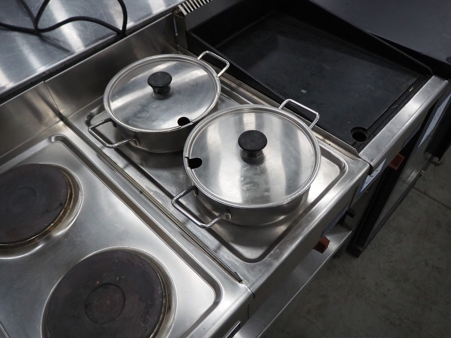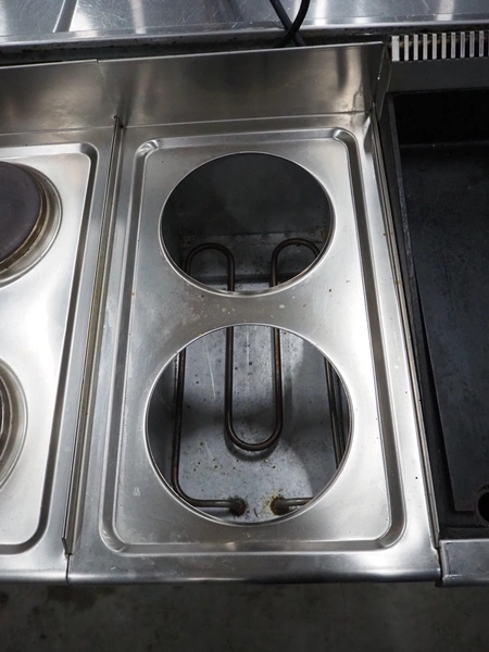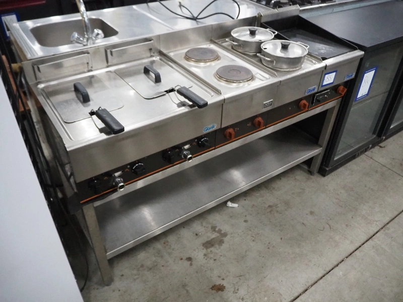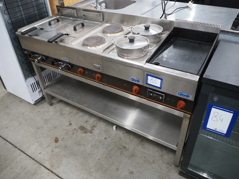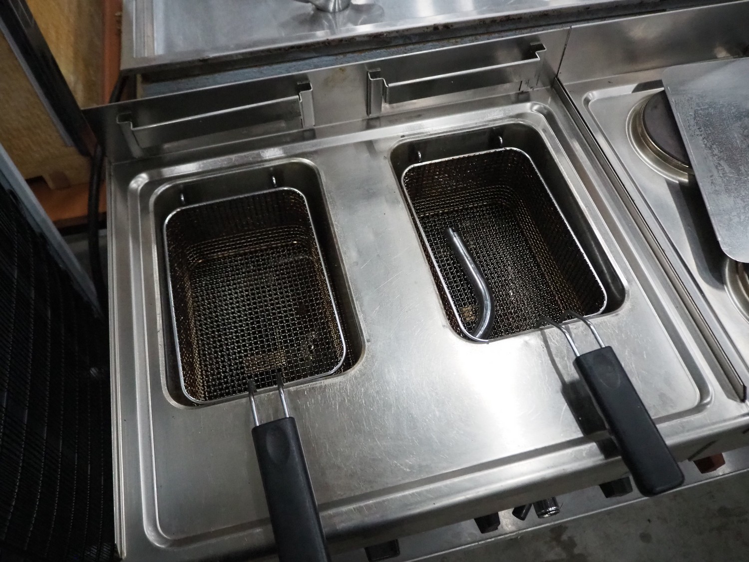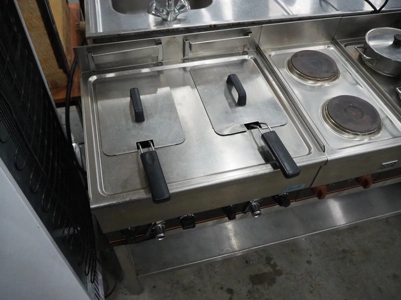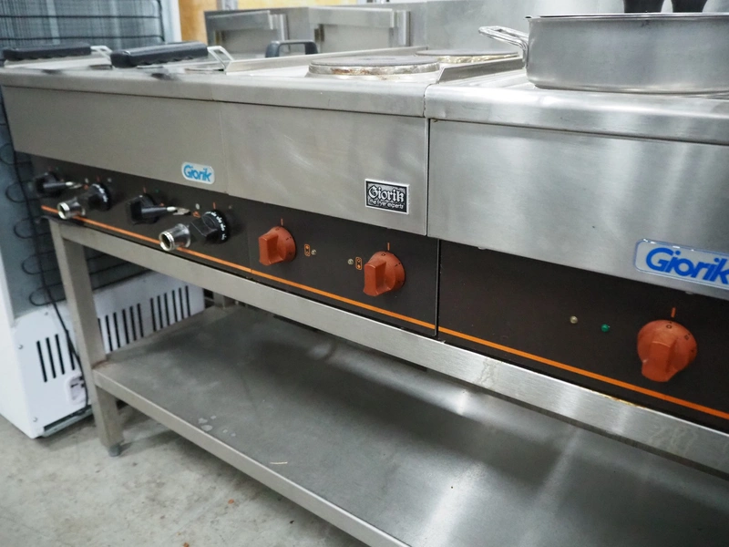 Giorik kitchen counter consisting of 2 deep fryers, 3 stoves with 2 pits and frying plate, dimensions: 550 mm x 1500 mm x 1000 mm.