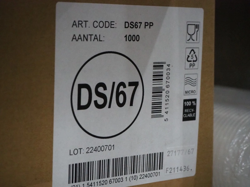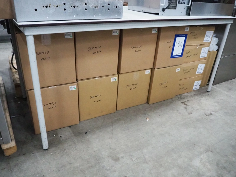 13 boxes with approximately 1000 plastic sauce cups each box, dimensions cups: 65 mm x 30 mm.