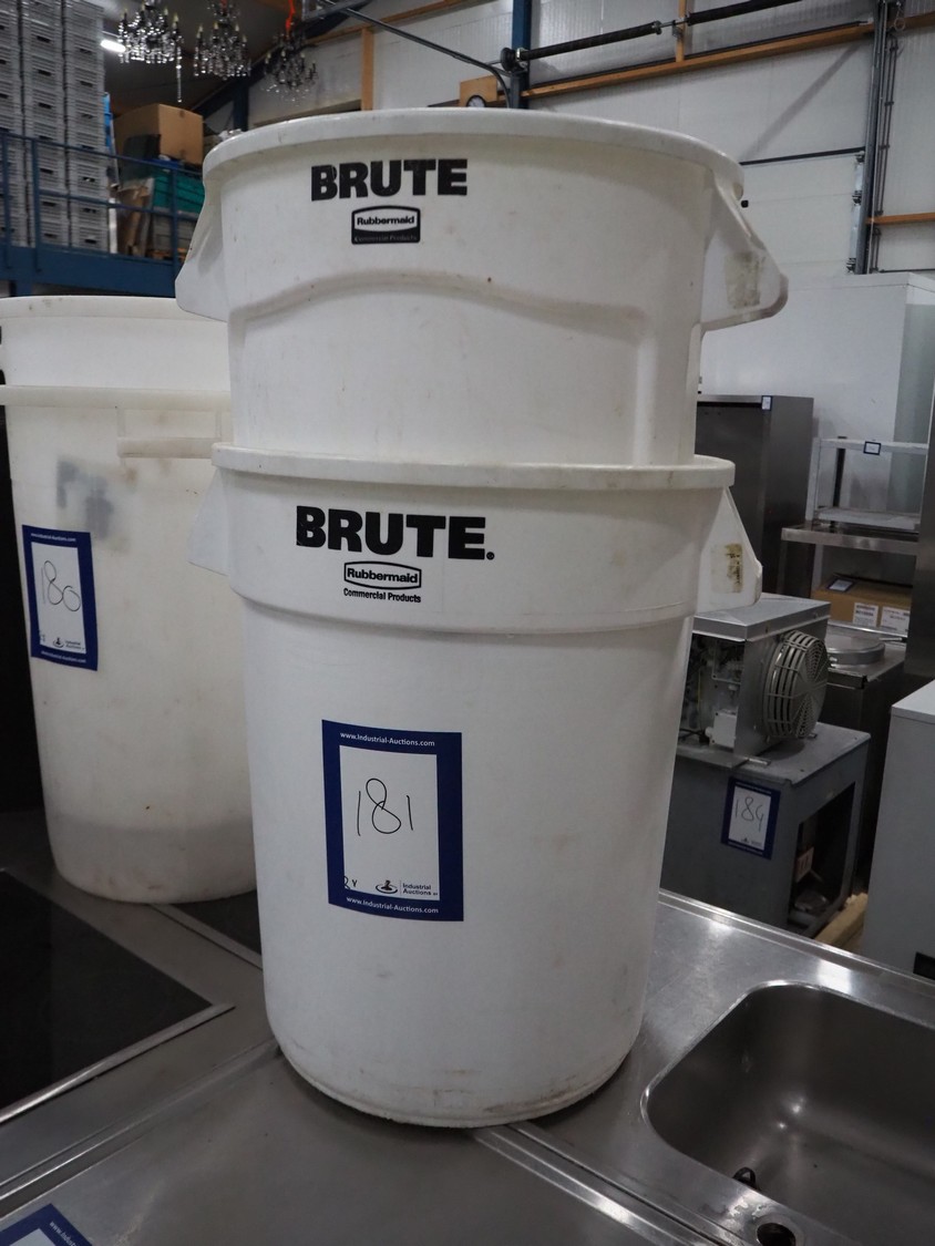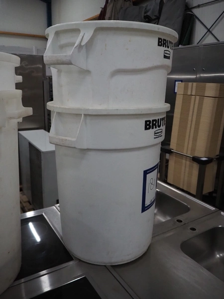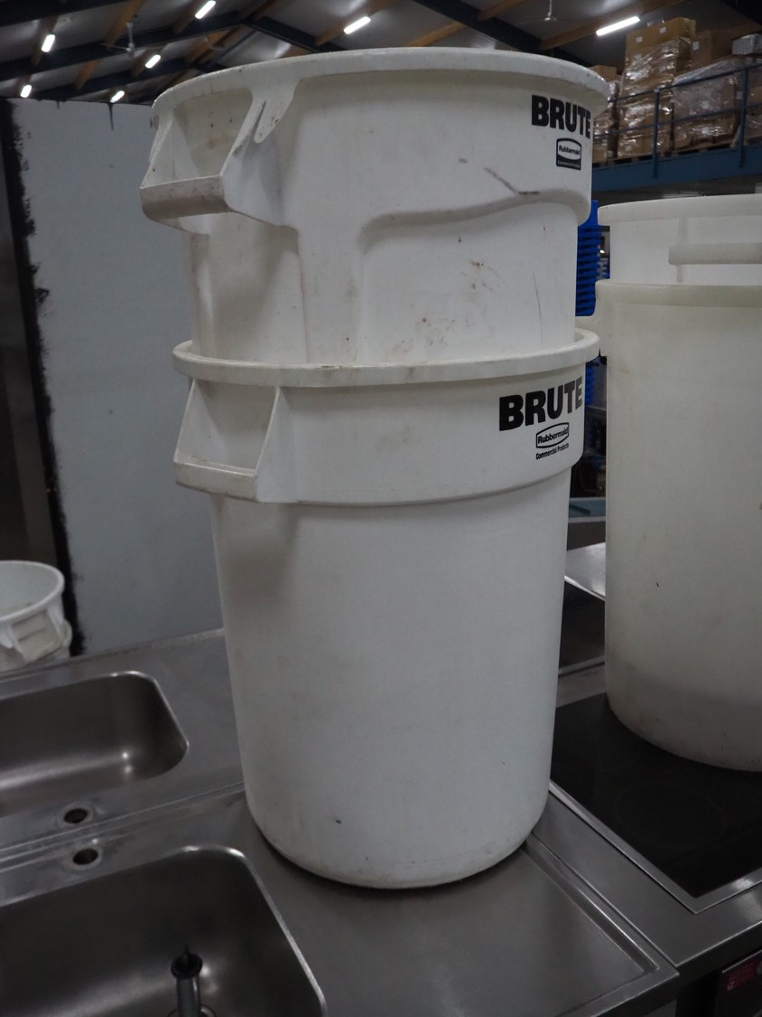 2 plastic Rubbermaid tubs, dimensions: (2x) 620 mm x 550 mm x 700 mm.