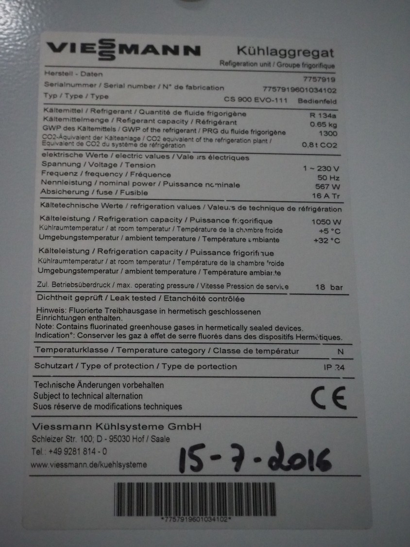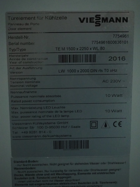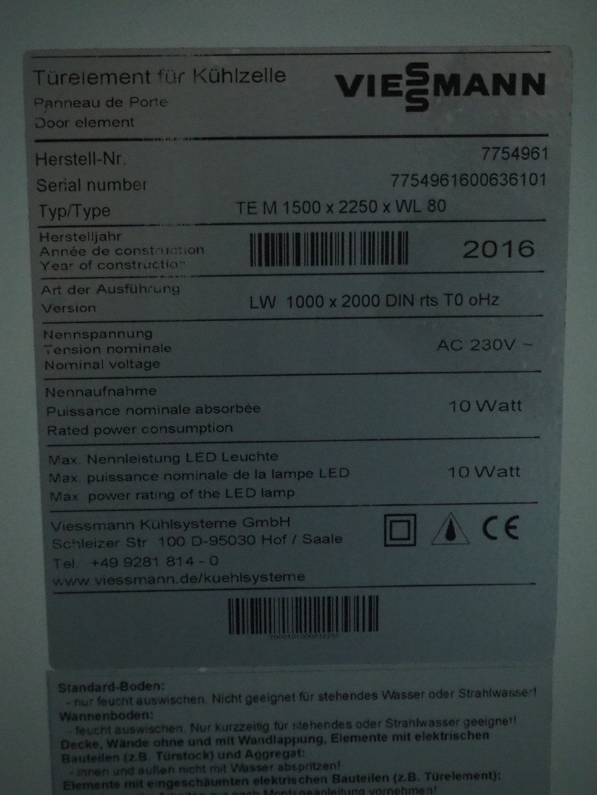 Viessmann cooling cell, type: TE M 1500 x 2250 x WL 80, year of construction: 2016, inside dimensions: 1350 mm x 2250 mm x 2250 mm, total dimensions: 1900 mm x 2400 mm x 2600 mm.