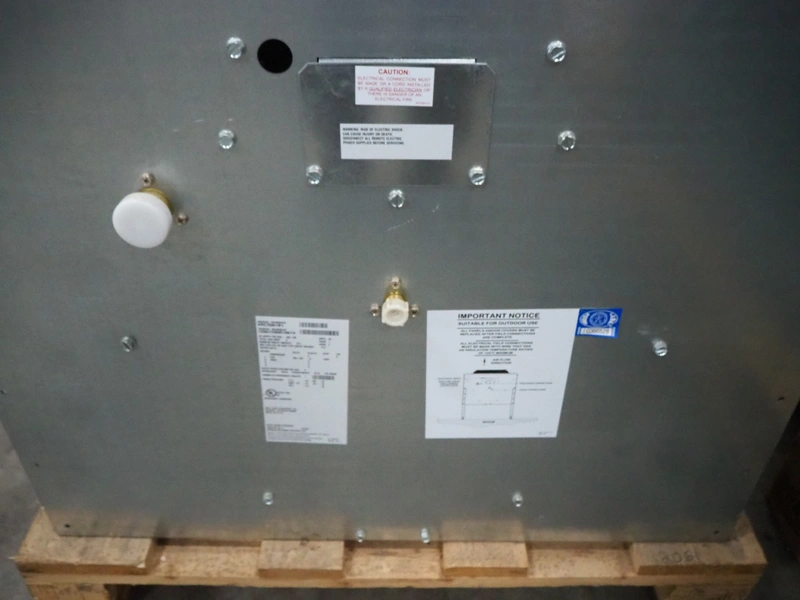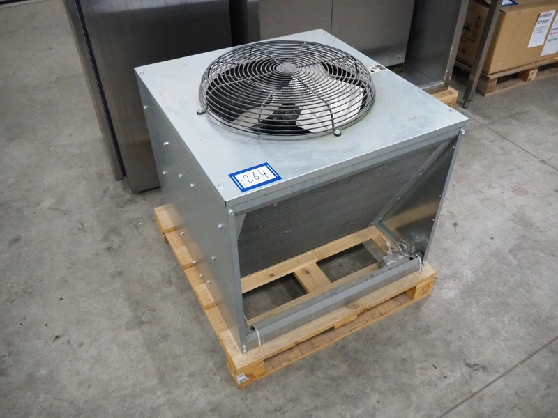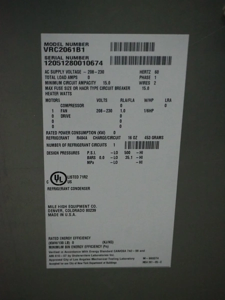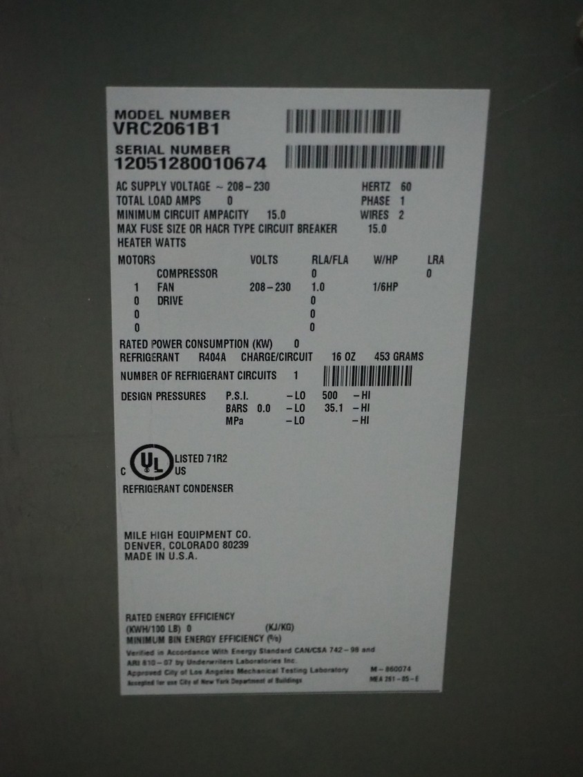 Mile High Equipment condenser, model: VRC2061B1, serial number: 12051280010674, 208/230 V, 1 Ph, 60 Hz, 15.0 A, refrigerant: R404A/453 gram, dimensions: 750 mm x 720 mm x 650 mm.