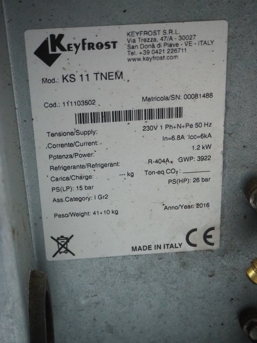 Keyfrost S.r.l. cooling compressor, model: KS 11 TNEM, serial number: 00081488, year of construction: 2016, 230 V, 1 Ph, 50 Hz, 6.8 A, 1.2 kW, refrigerant: R404A, weight: 41+10 kg, dimensions: 450 mm x 760 mm x 410 mm.