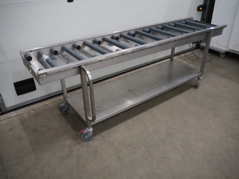 Mobile s/s roller conveyor with plastic rollers, roller width: 520 mm, total dimensions: 2600 mm x 720 mm x 890 mm.