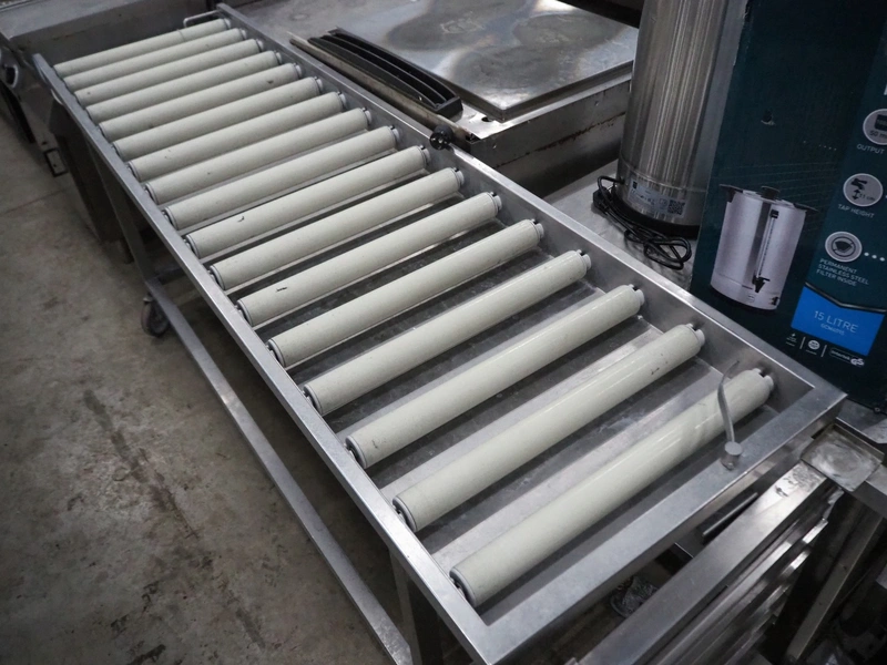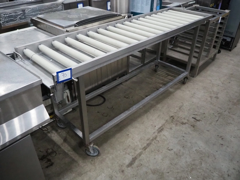Mobile roller conveyor for washing machine, plastic rollers, roller width: 500 mm, total dimensions: 2130 mm x 580 mm x 900 mm.
