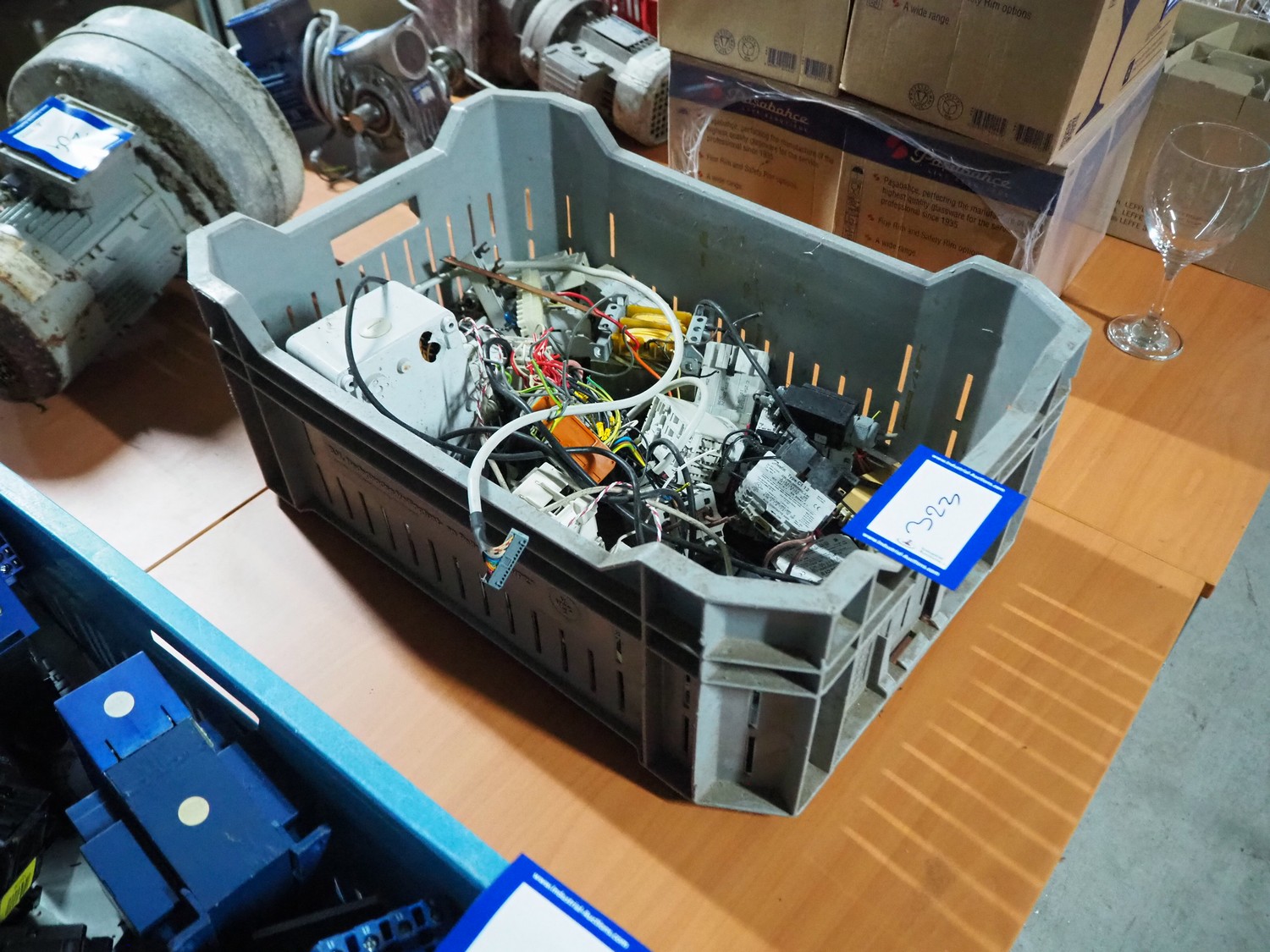 Plastic crate with electrical parts.