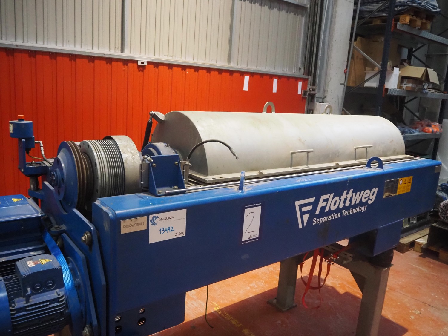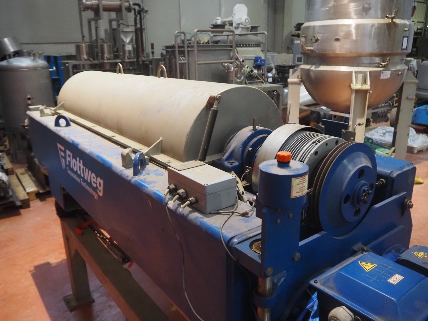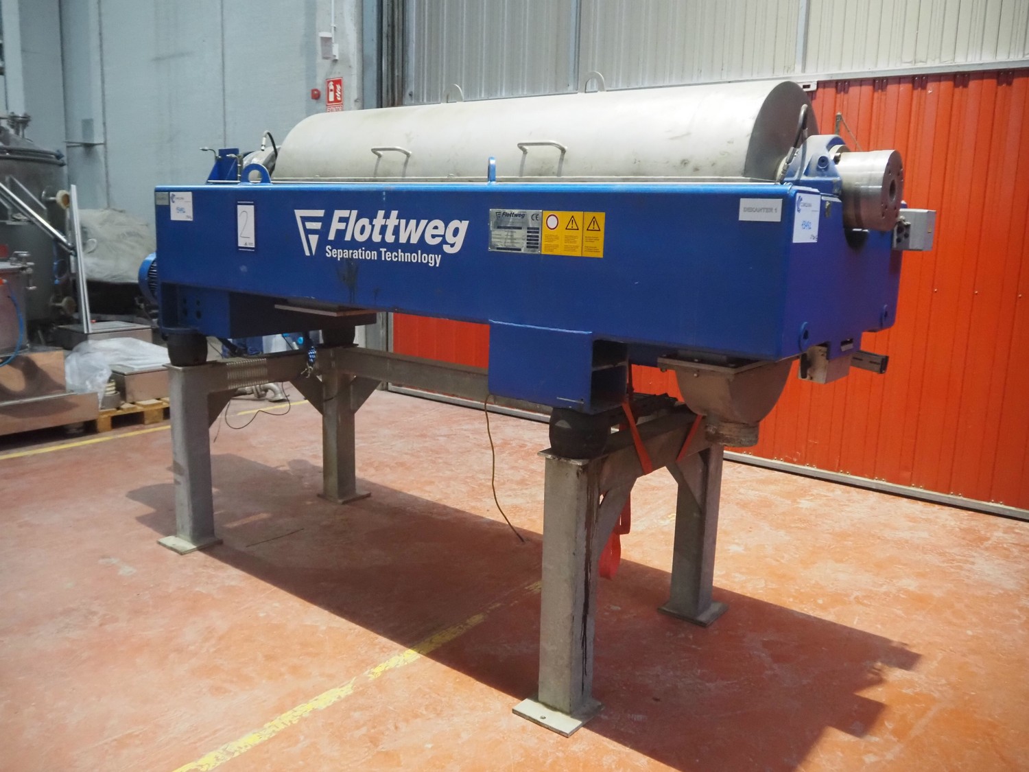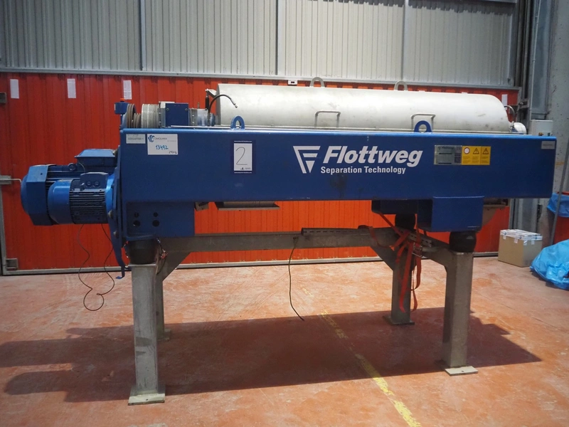 Flottweg Separation Technology decanter, type: DECANTER Z4E-4/454, number: 012.333.09, year of construction: 2004, maximum speed: 4200 rpm, maximum density: 1.4 kg/dm³, maximum product temperature: 0/100°C, weight: 2920 kg, dimensions: 3400 mm x 1000 mm x 1900 mm. Without switch cabinet.