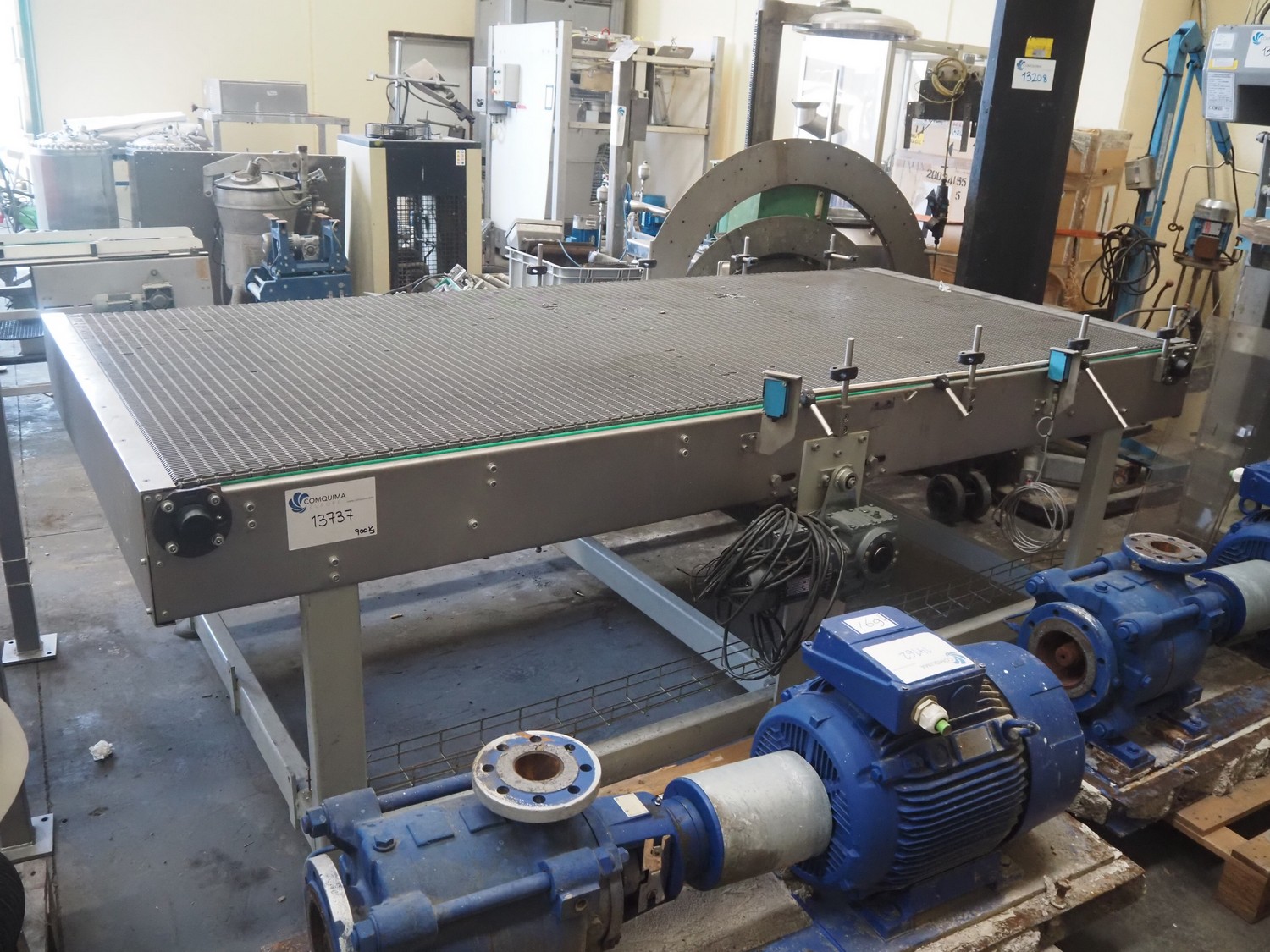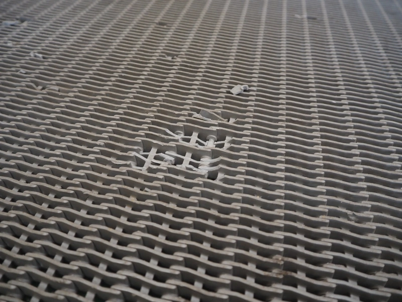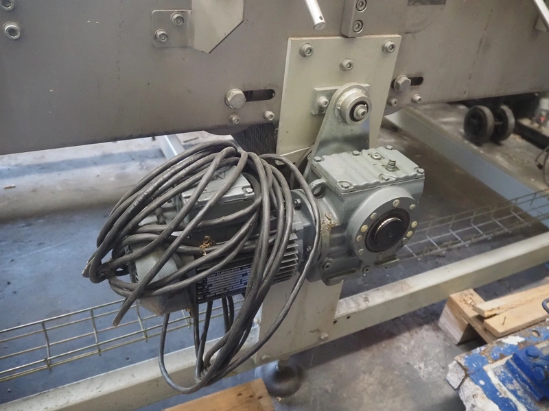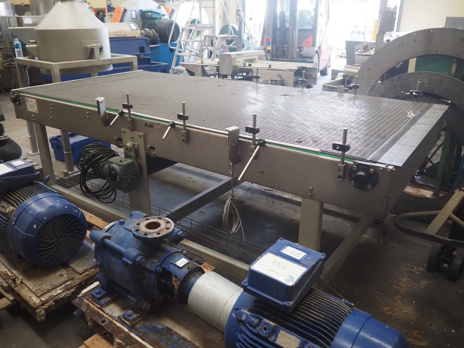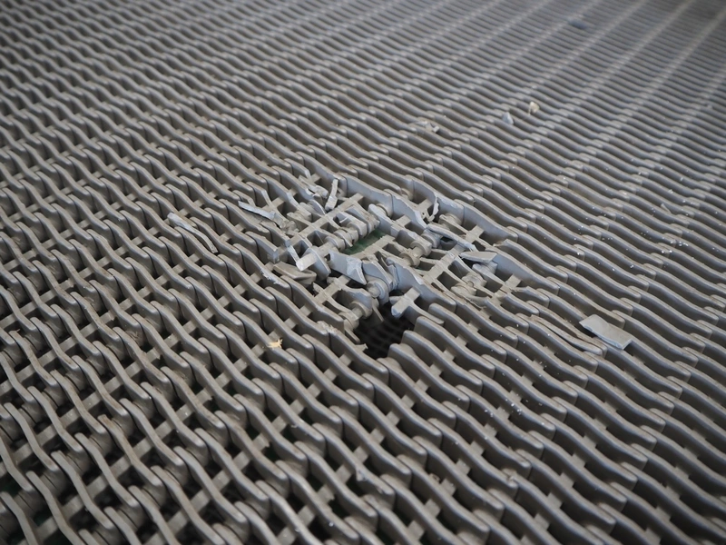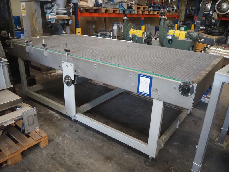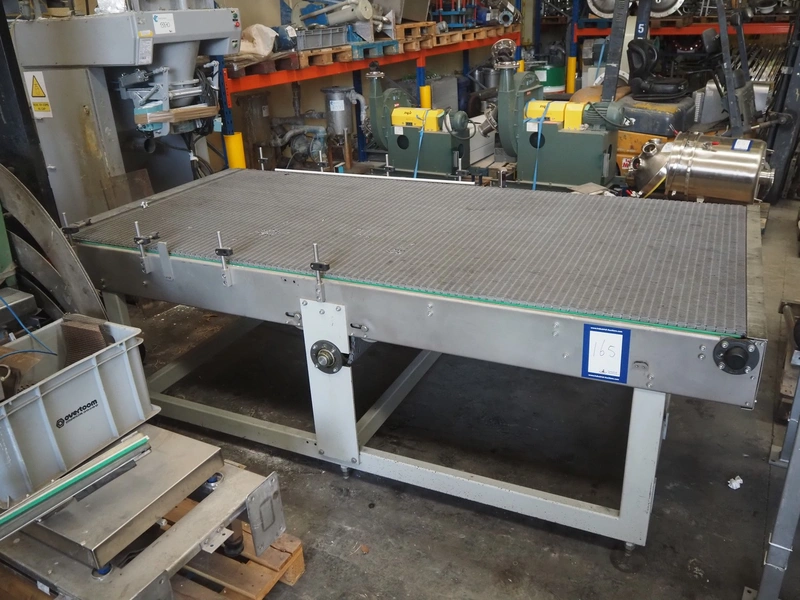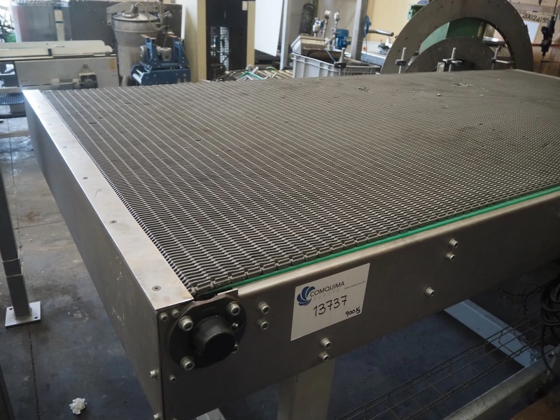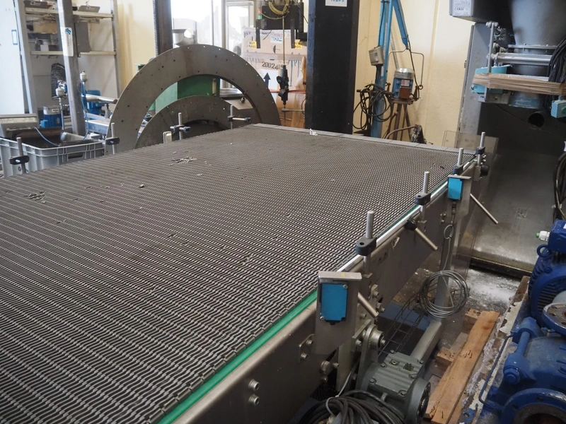 Transport belt, plastic mesh belt, belt width: 1400 mm, total dimensions: 3000 mm x 1450 mm x 1000 mm. Belt damaged.