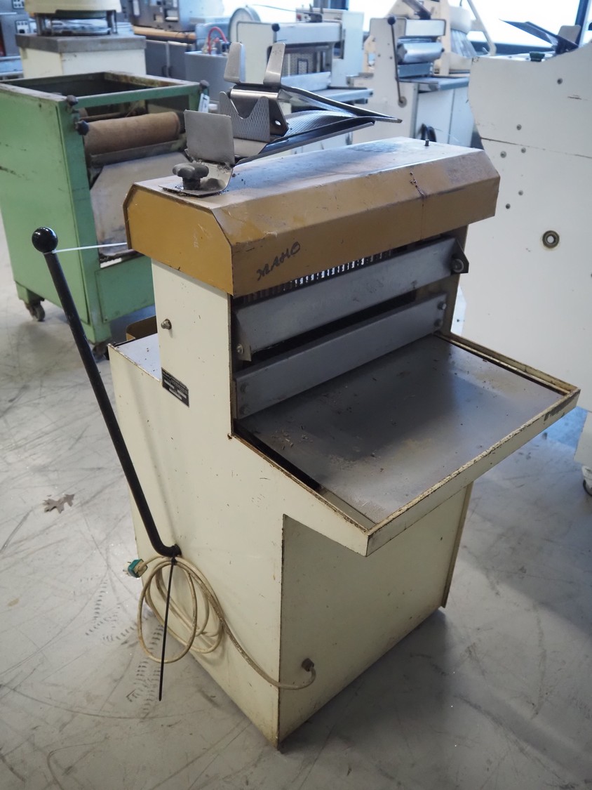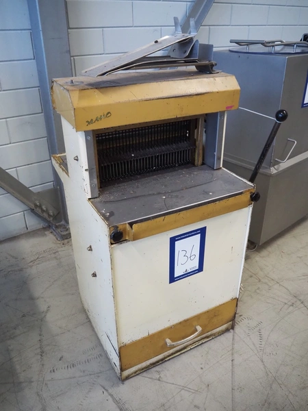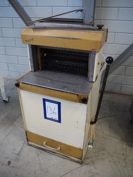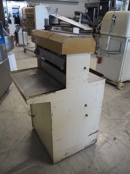 Machinefabriek Holtkamp B.V. bread slicer, type: 412, machine number: 800512, 220 V, 30 knives, distance between knives: 12 mm, working width: 405 mm, total dimensions: 630 mm x 700 mm x 1150 mm.
