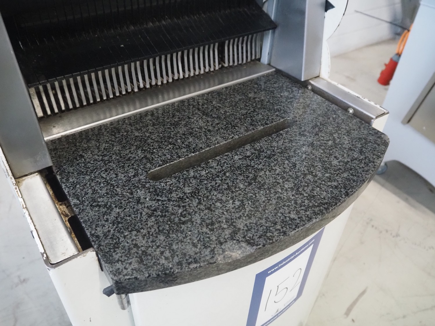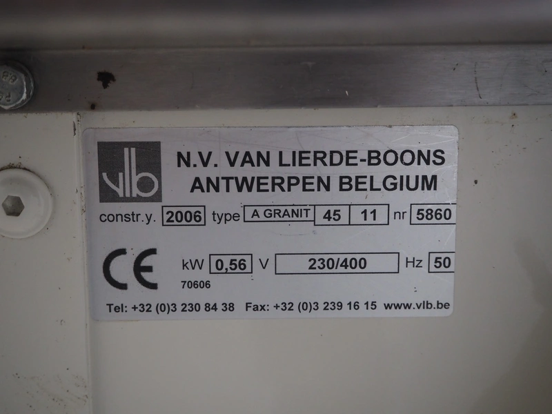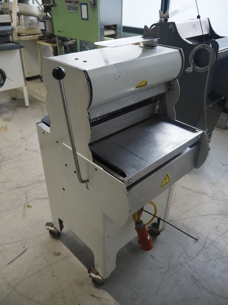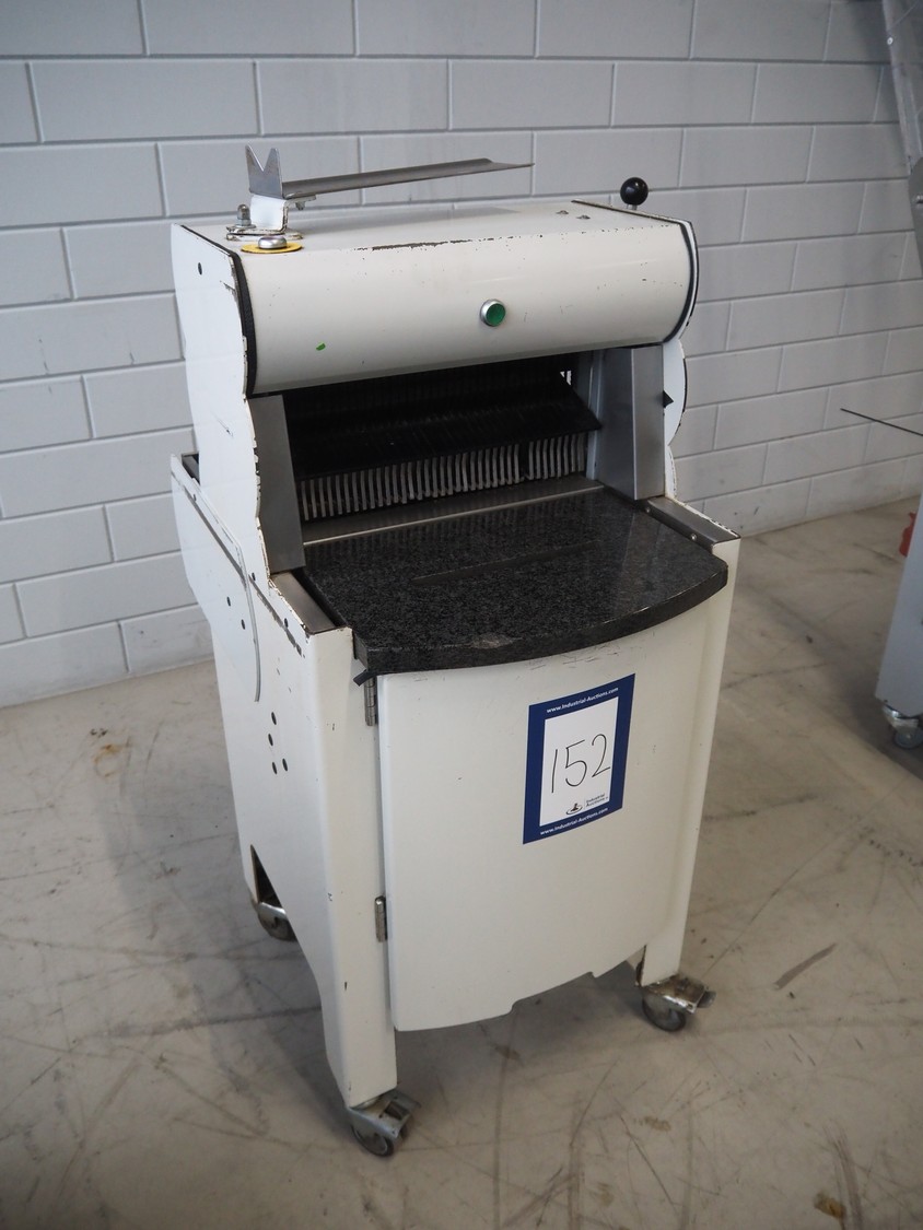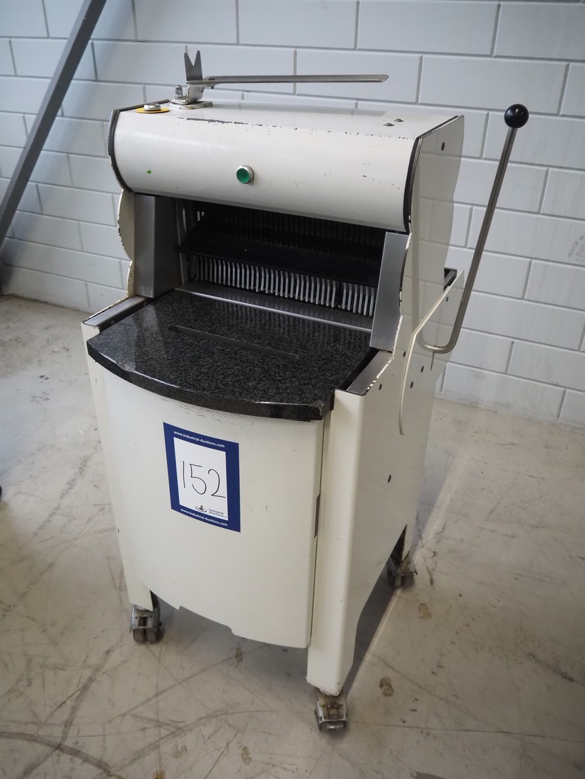 VLB mobile bread slicer, type: A Granit 45 11, number: 5860, year of construction: 2006, 230/400 V, 50 Hz, 0.56 kW, 38 knives, distance between knives: 11 mm, working width: 420 mm, total dimensions: 750 mm x 660 mm x 1270 mm.