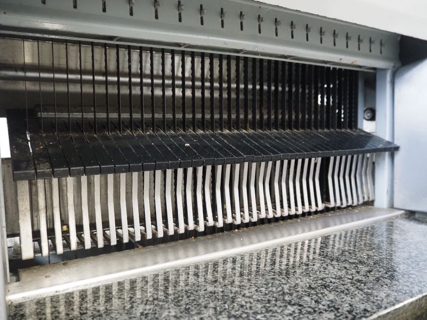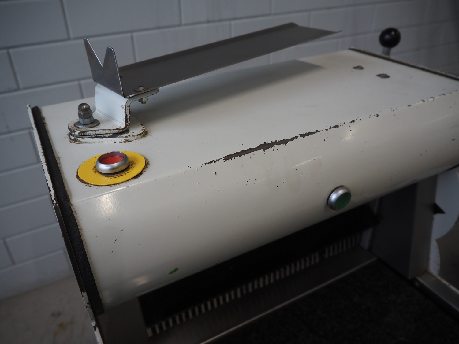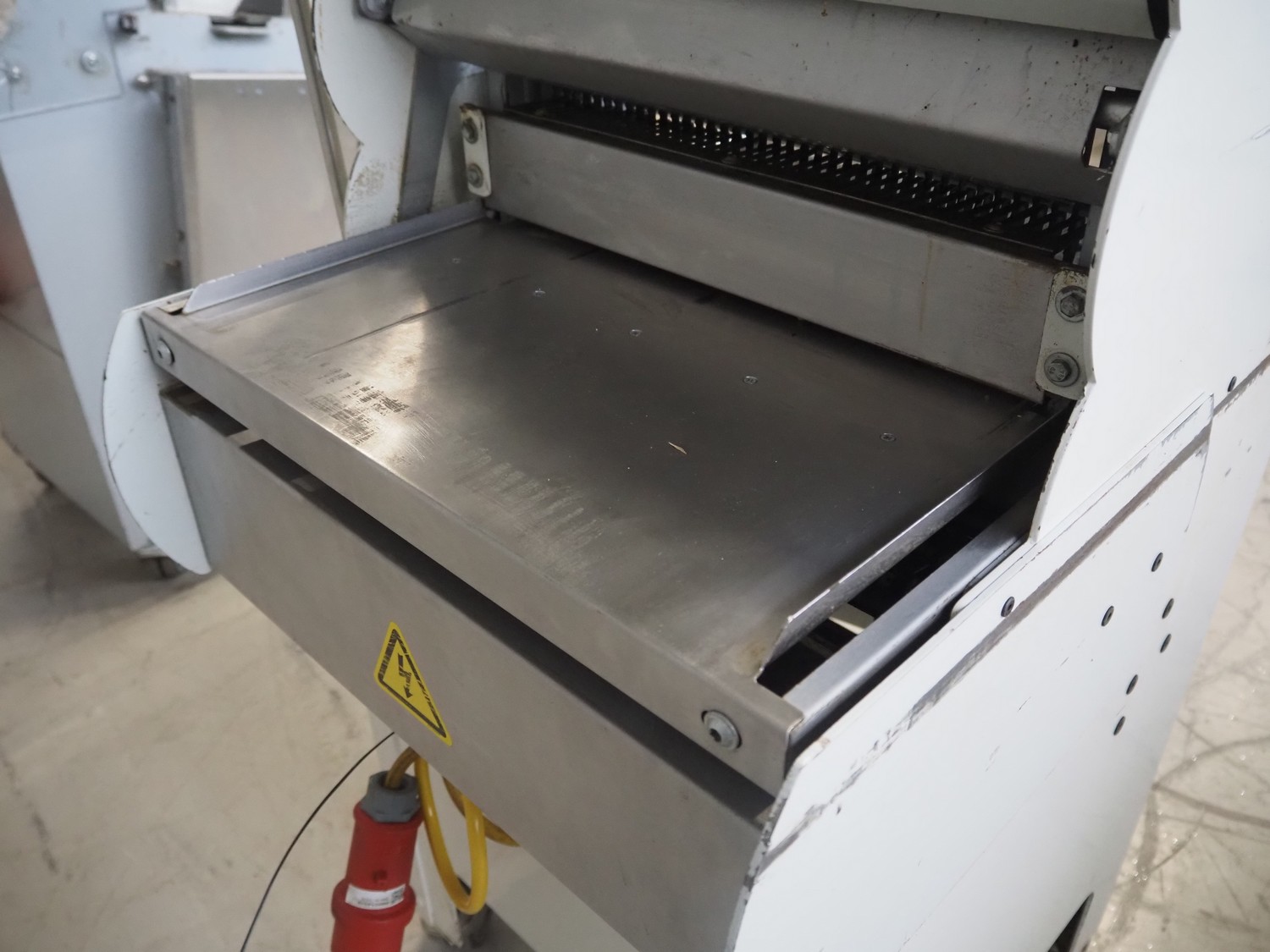 VLB mobile bread slicer, type: A Granit 45 11, number: 5860, year of construction: 2006, 230/400 V, 50 Hz, 0.56 kW, 38 knives, distance between knives: 11 mm, working width: 420 mm, total dimensions: 750 mm x 660 mm x 1270 mm.