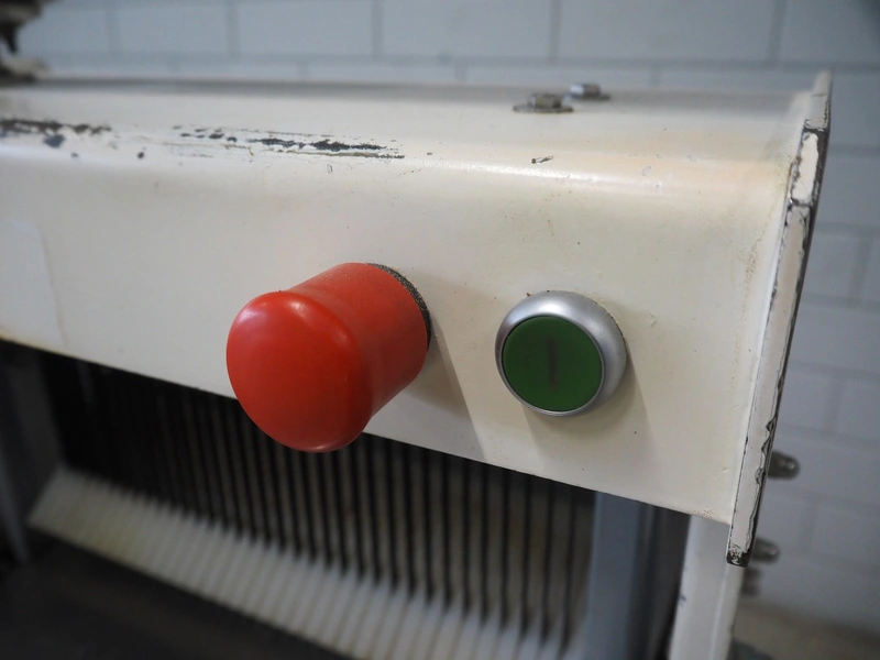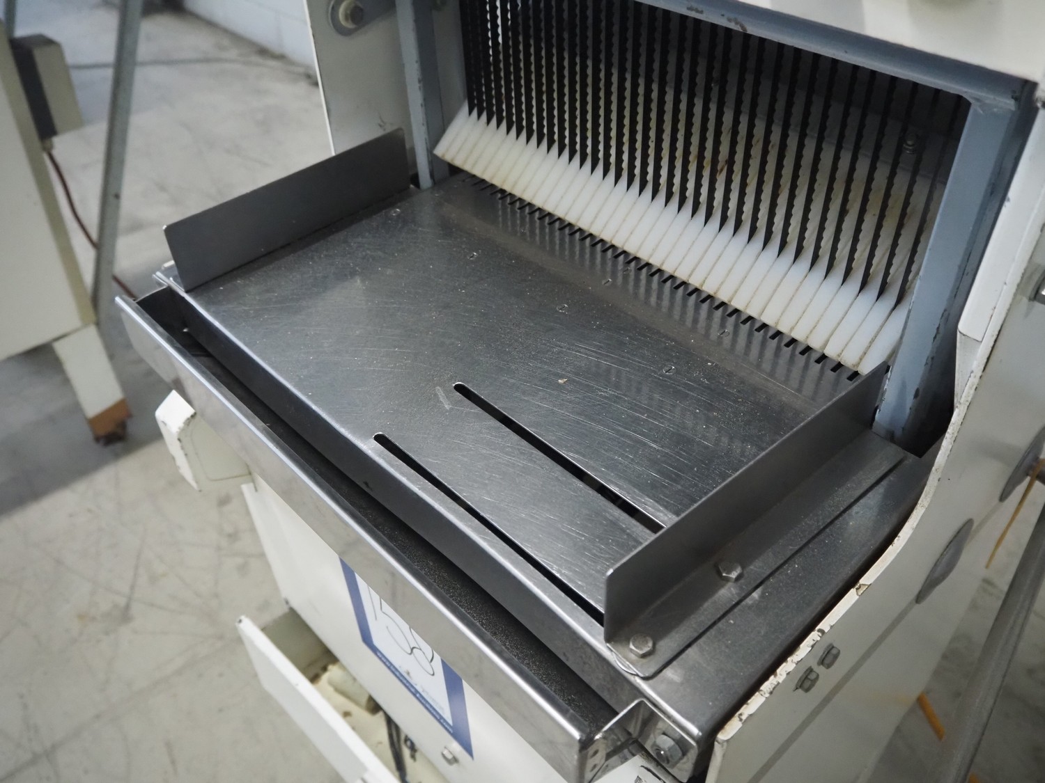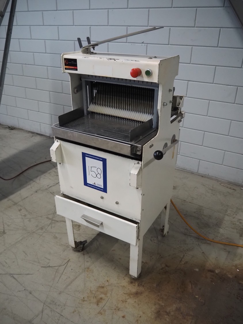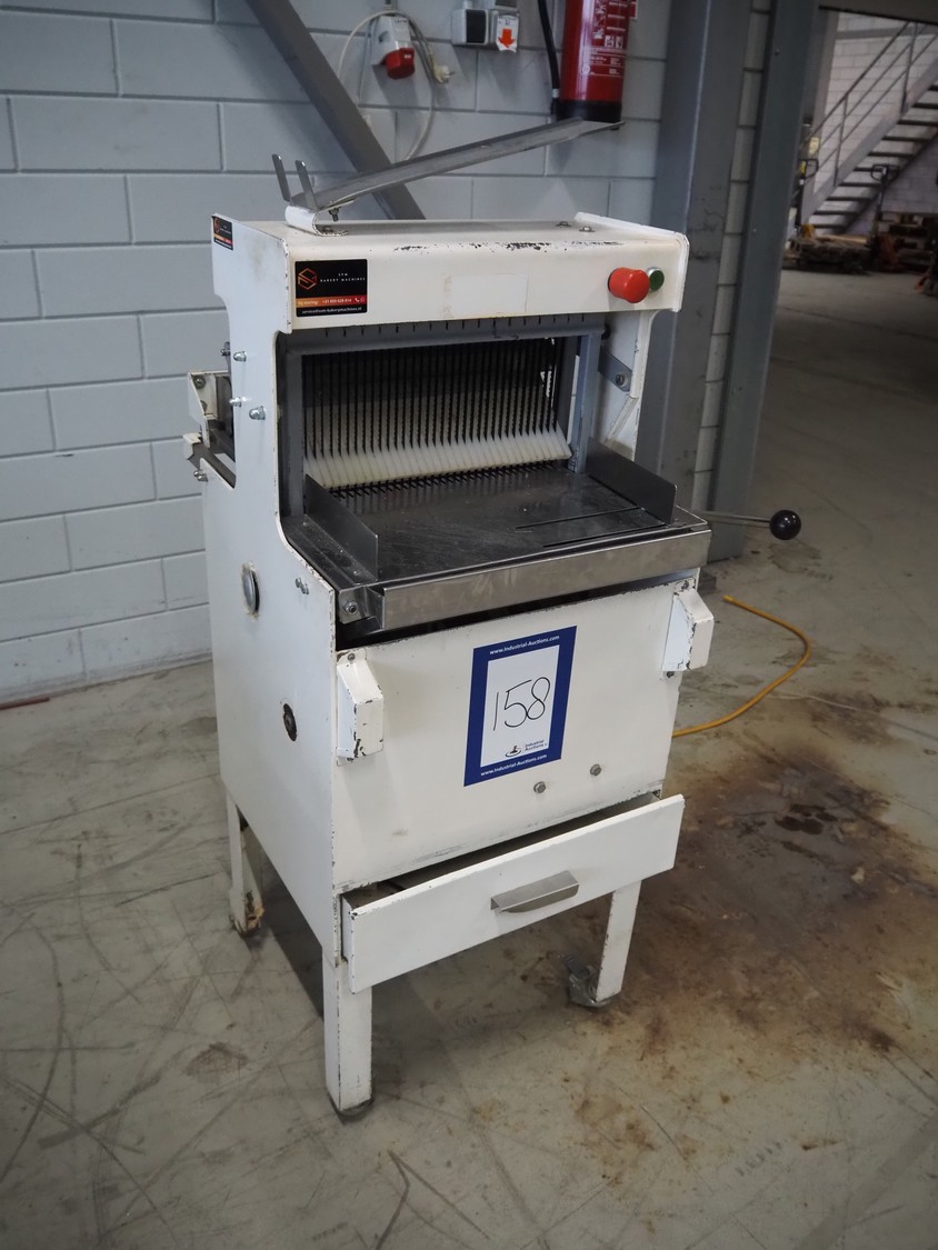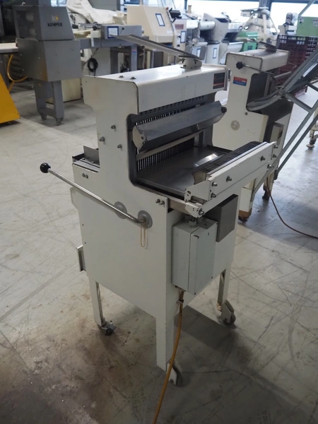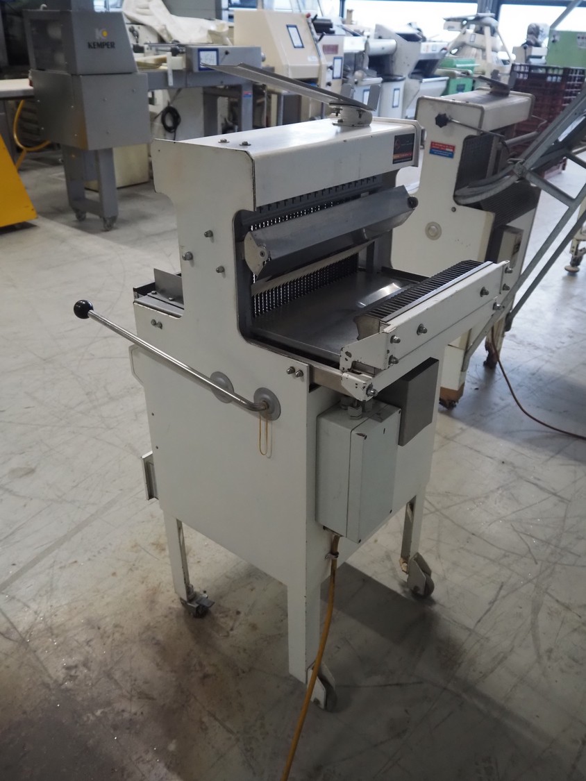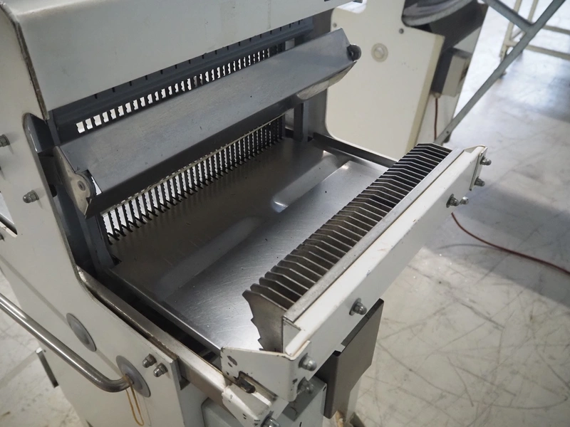 Mobile bread slicer, 34 knives, distance between knives: 11 mm, working width: 380 mm, total dimensions: 660 mm x 630 mm x 1320 mm.