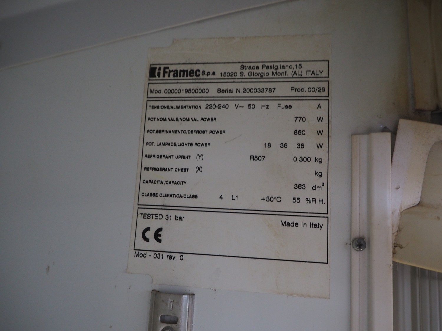 Framec freezer, model: 0000019500000, serial number: 200033787, year of construction: 00/29, 220-240 V, 50 Hz, 860 W, refrigerant: R507, 0.300 kg, volume: 363 dm³, dimensions: 670 mm x 700 mm x 1980 mm.
