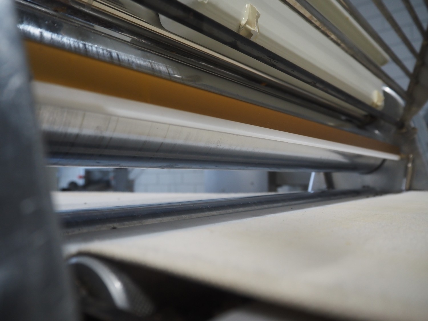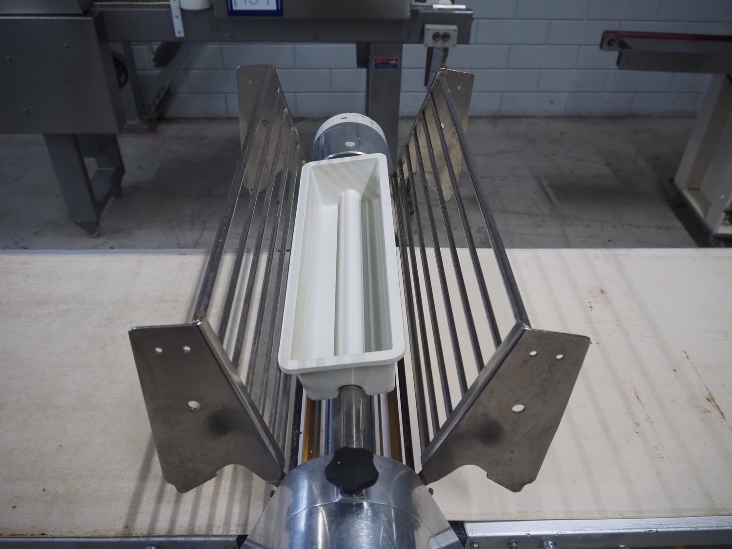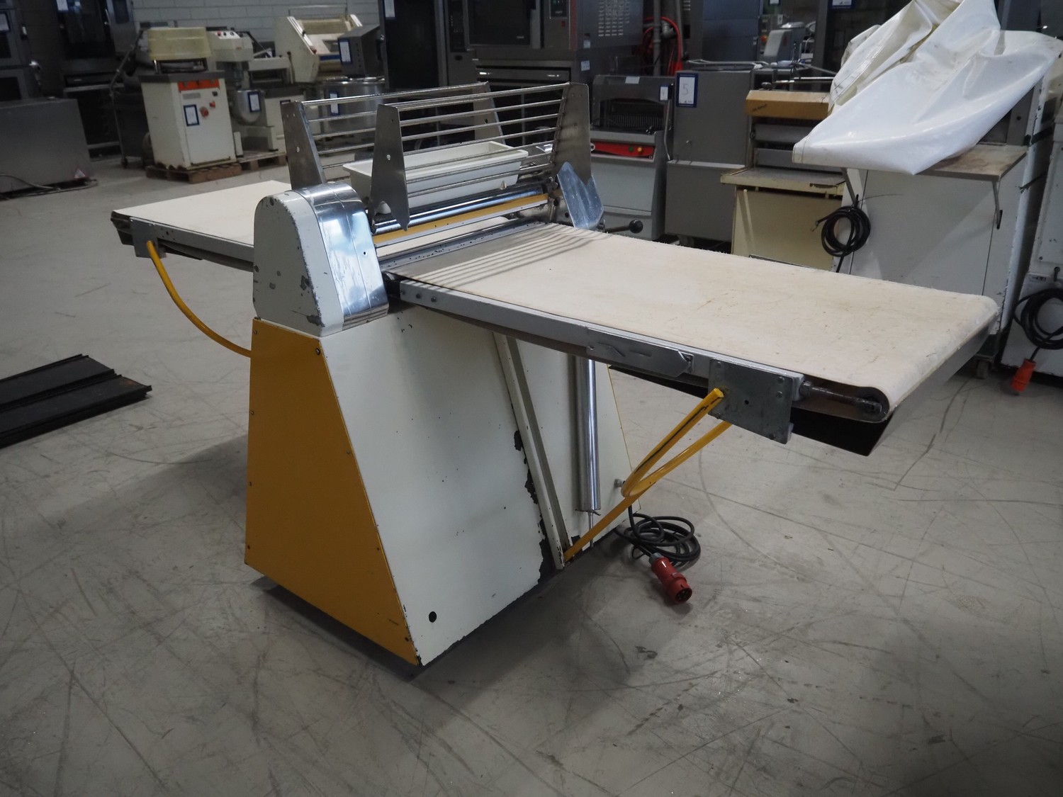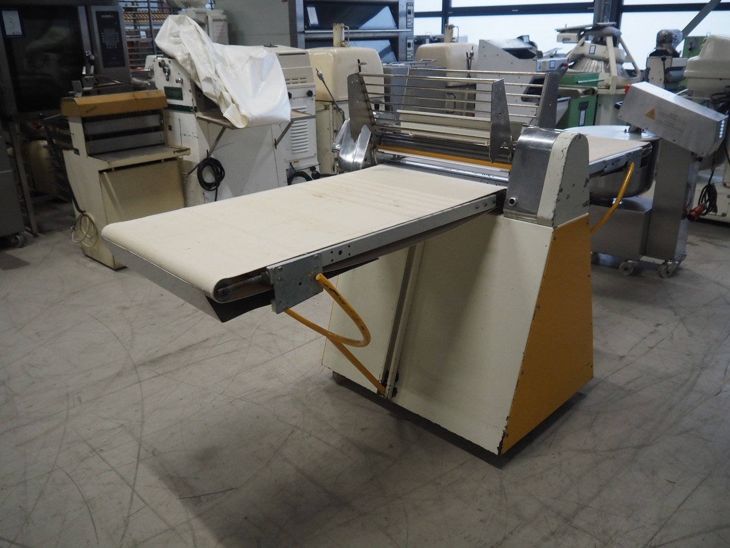 Seewer rondo mobile dough sheeter, cloth belt, belt width: 590 mm, total dimensions: 2450 mm x 1100 mm x 1270 mm.