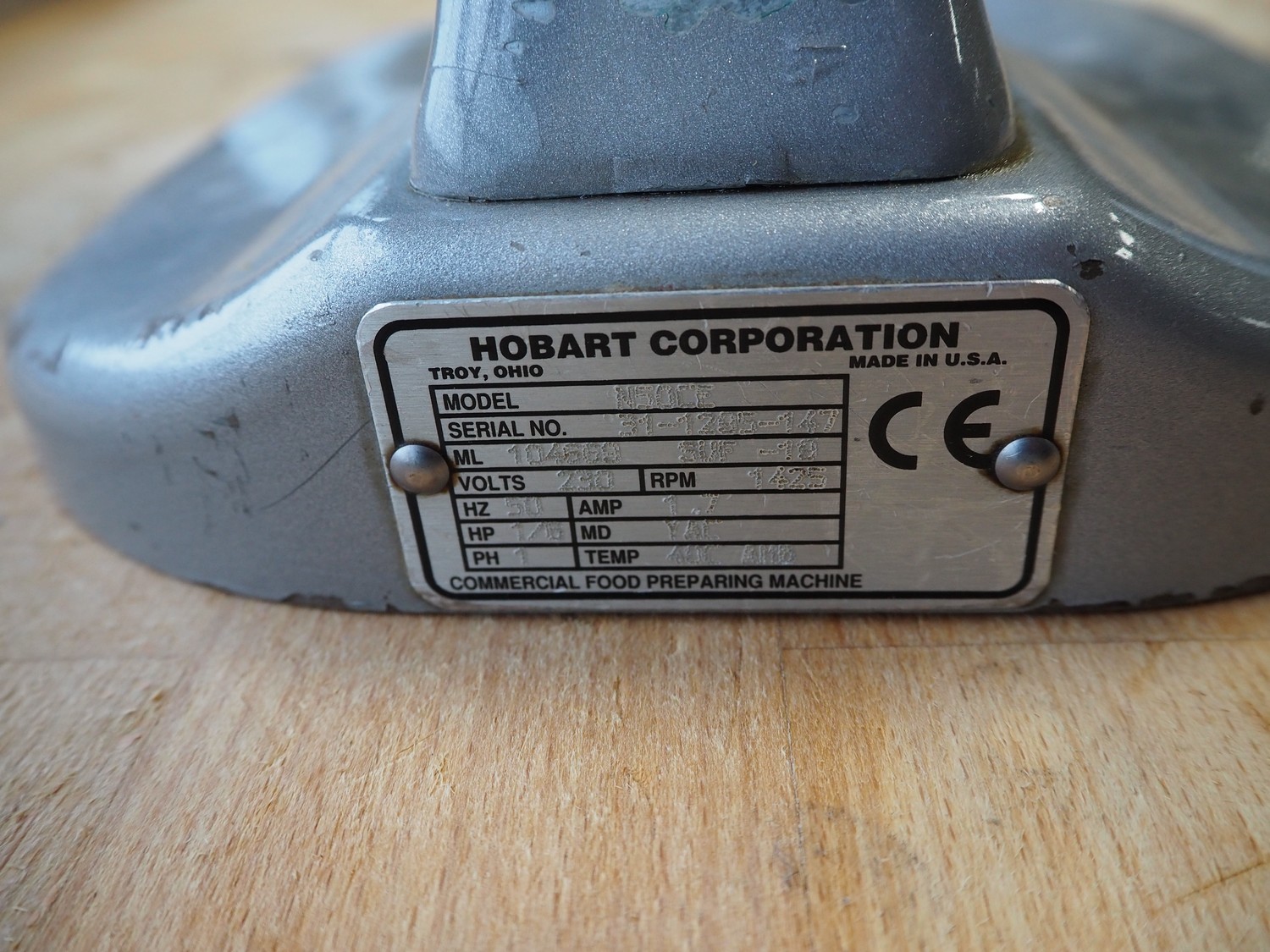 Hobart mixer, model: N50CE, serial number: 31-1285-147, 230 V, 1 Ph, 50 Hz, 1.7 A, dimensions: 350 mm x 250 mm x 430 mm. Incomplete.