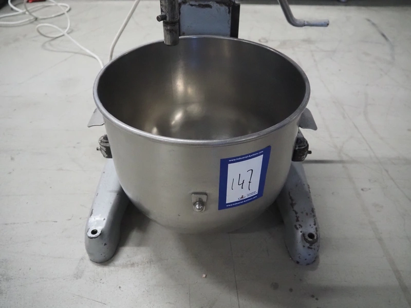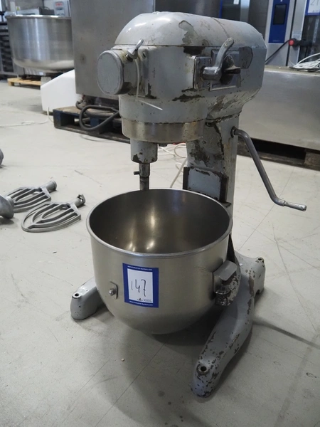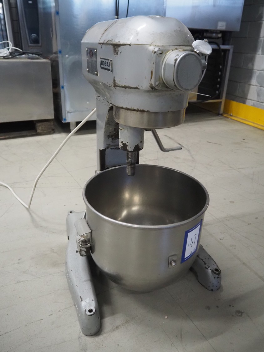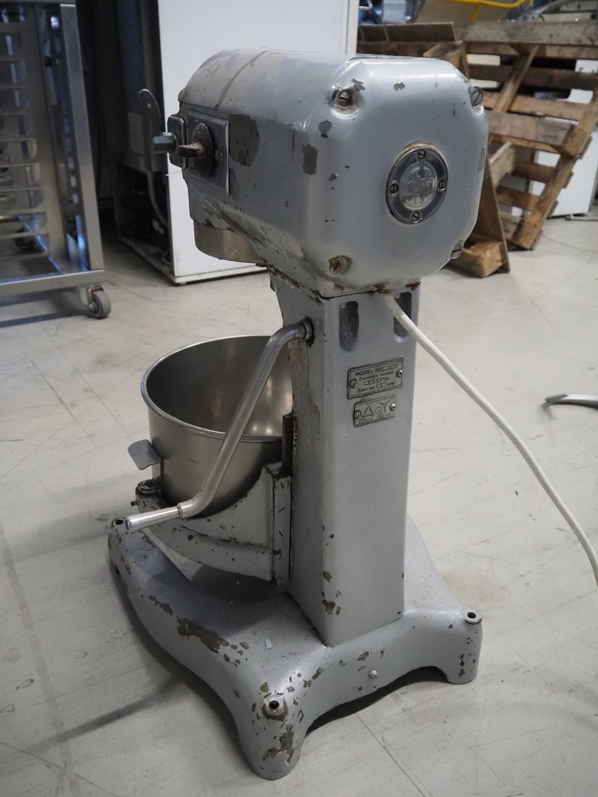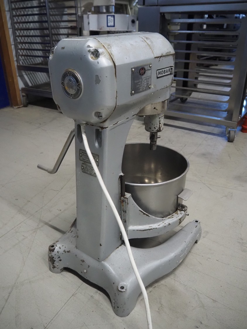 Hobart mixer, model: A200, serial number: 720433, 380 V, 3 Ph, 50 Hz, 0.98 A, inside dimensions: Ø 320 mm x 300 mm, total dimensions: 450 mm x 480 mm x 750 mm. Including 3 whisks, 2 flat beaters and 1 hook.