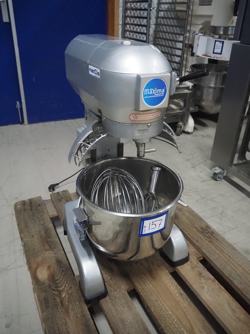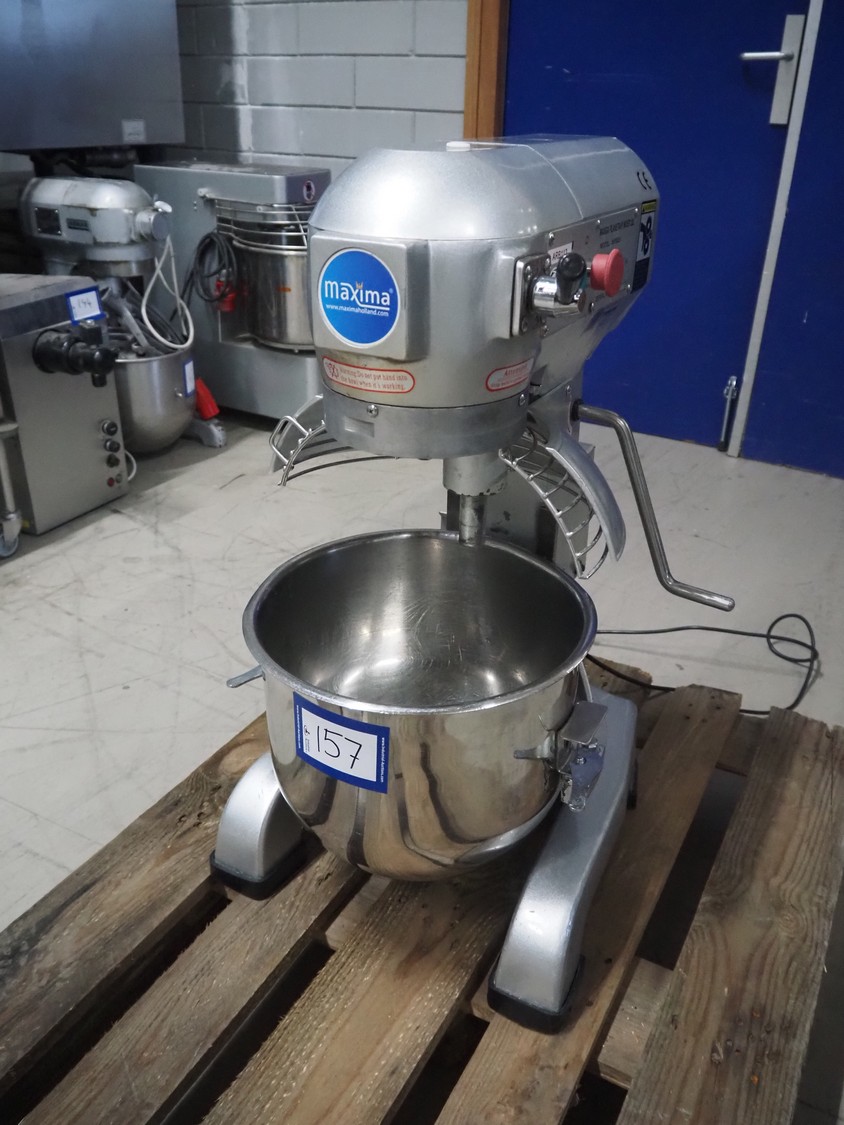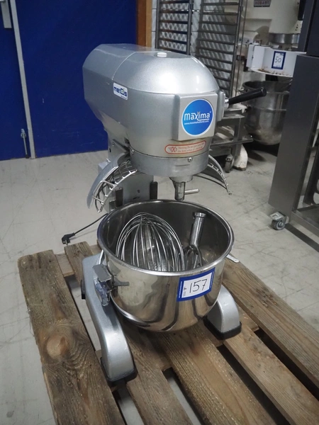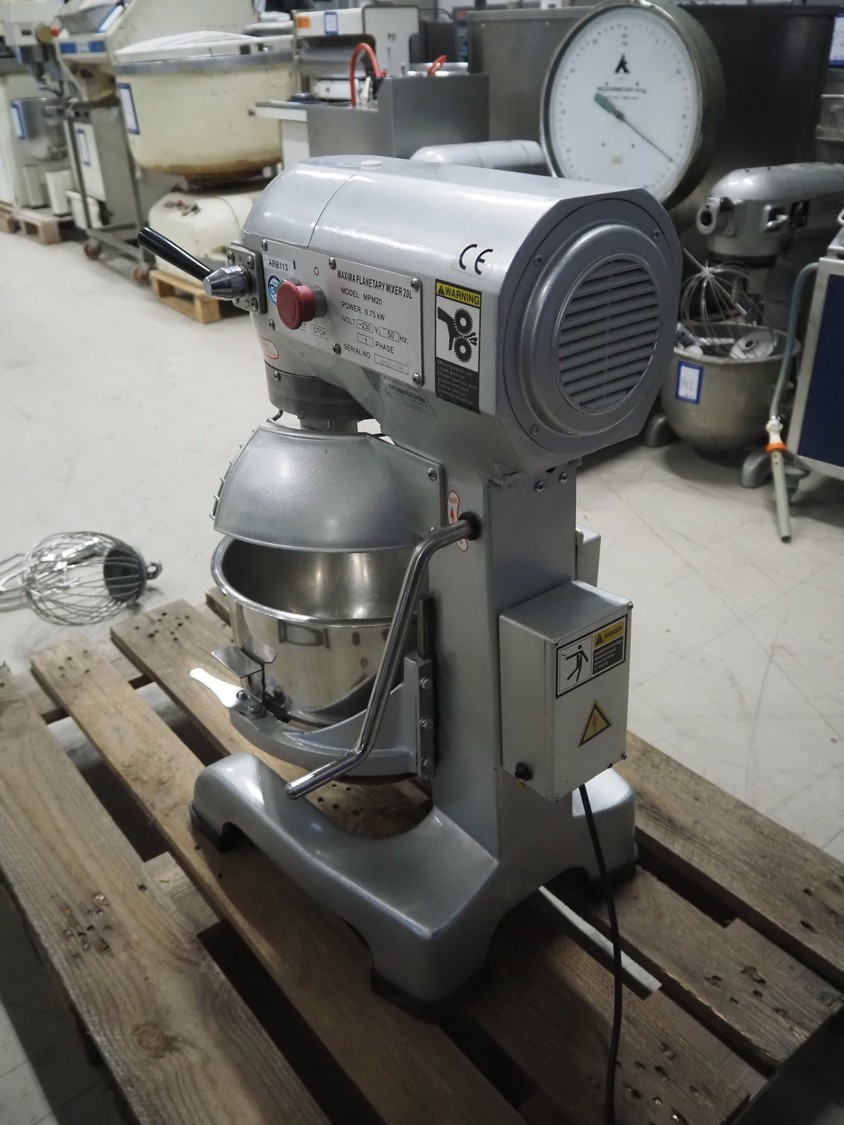 Maxima mixer, model: MPM20, serial number: MPM20-2490, 230 V, 1 Ph, 50 Hz, 0.75 kW, volume: 20 liter, dimensions: 530 mm x 470 mm x 800 mm. Including whisk and flat beater.