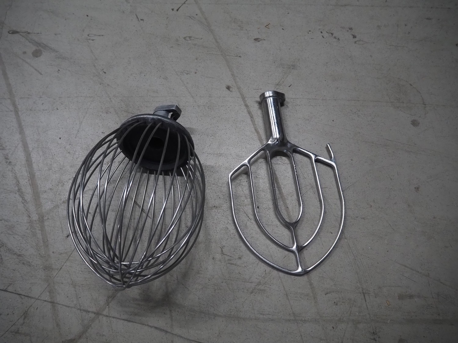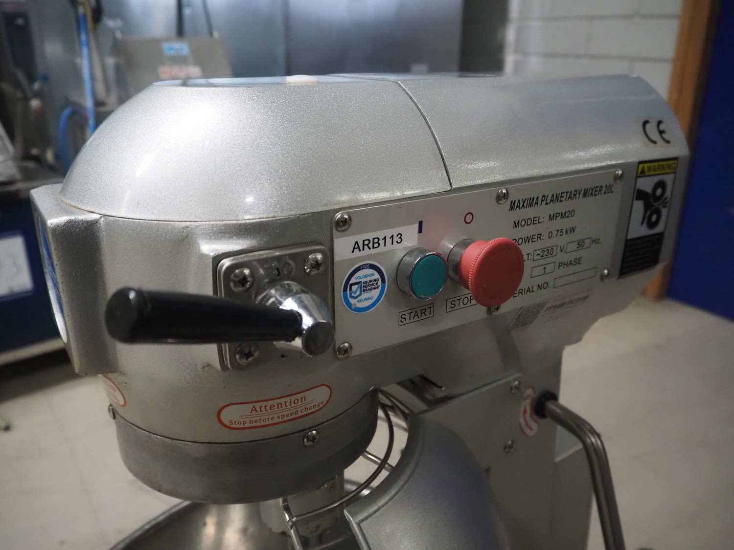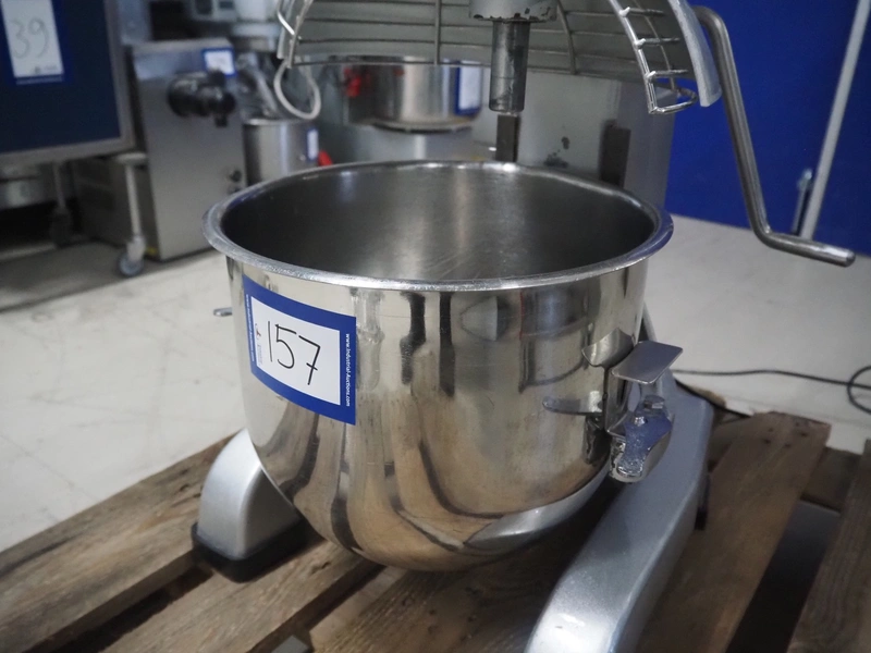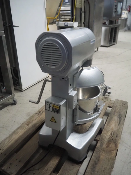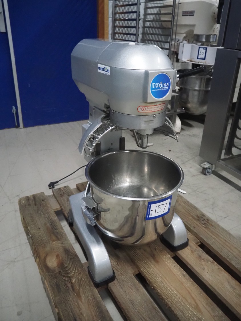 Maxima mixer, model: MPM20, serial number: MPM20-2490, 230 V, 1 Ph, 50 Hz, 0.75 kW, volume: 20 liter, dimensions: 530 mm x 470 mm x 800 mm. Including whisk and flat beater.