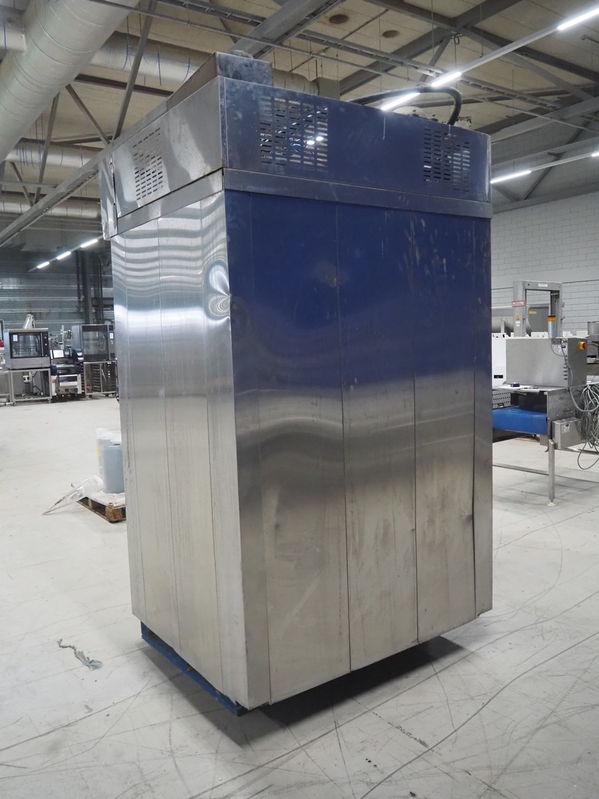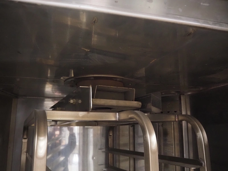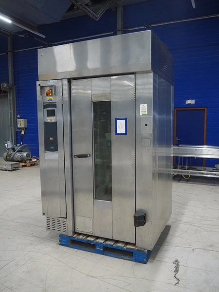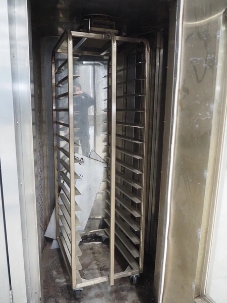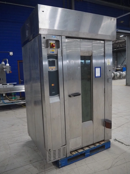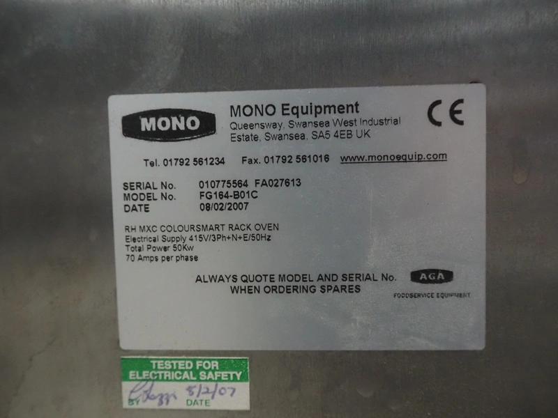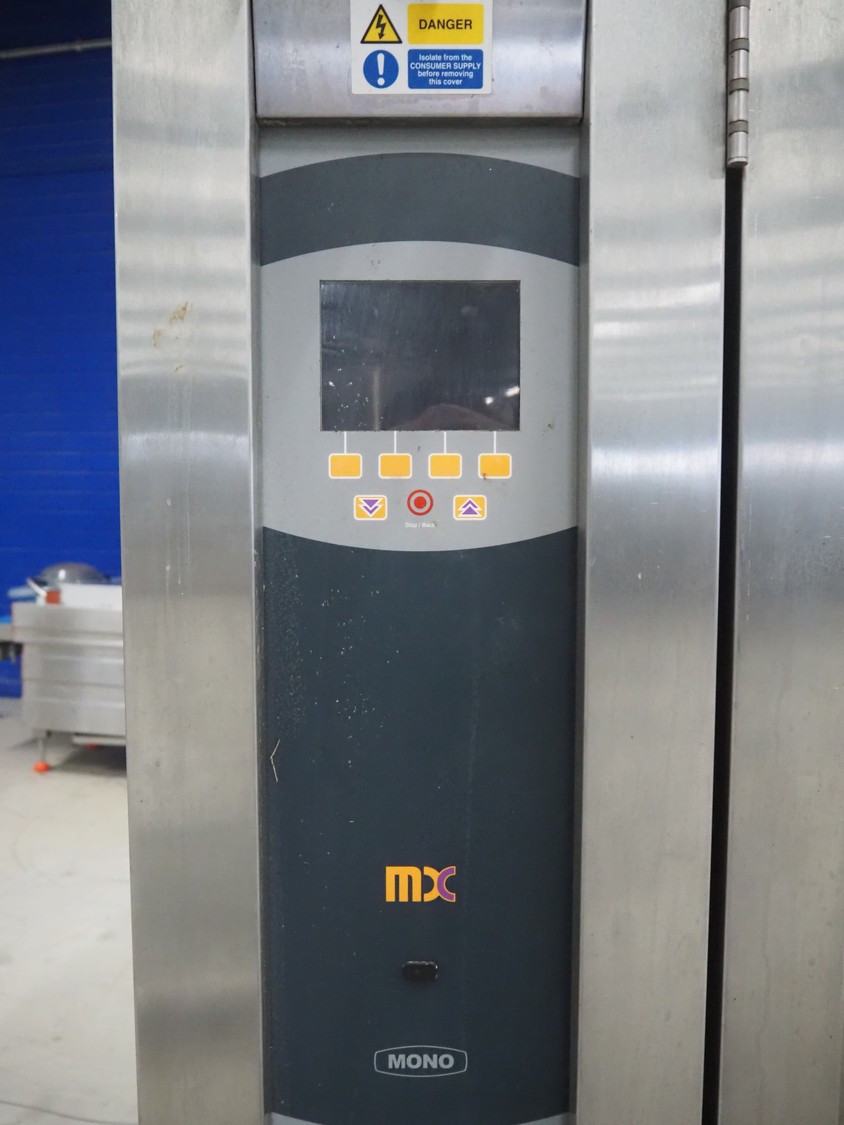 Mono Equipment rotation oven for 1 trolley, model: FG-164-B01C, serial number: 010775564 FA027613, year of construction: 08/02/2007, 415 V, 3 Ph, 50 Hz, 70 A, 50 kW, s/s trolley, 15 floors, floor dimensions: 700 mm x 470 mm, trolley dimensions: 750 mm x 530 mm x 1900 mm, total dimensions 1500 mm x 1350 mm x 2750 mm.