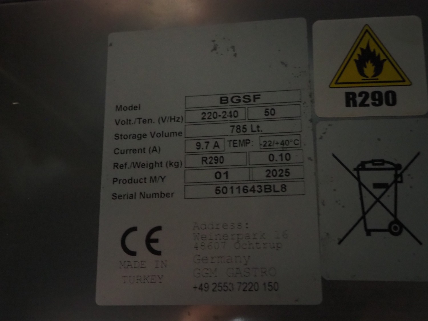 GGM Gastro proofing cabinet, model: BGSF, serial number: 5011643BL8, year of construction: 2025, 220-240 V, 50 Hz, 9.7 A, refrigerant: R290-0.10, dimensions floors: 650 mm x 410 mm, total dimensions: 1000 mm x 820 mm x 2100 mm.