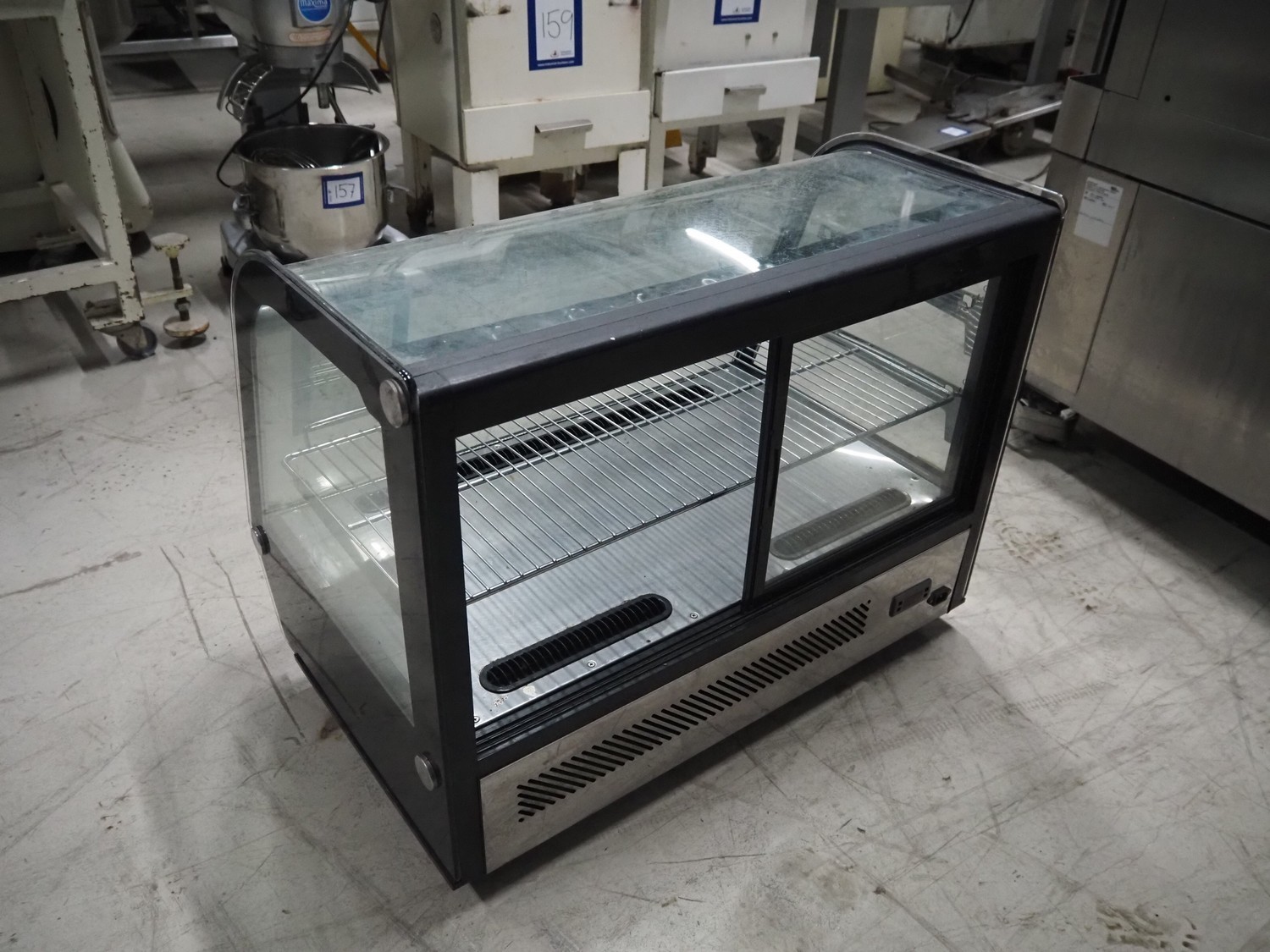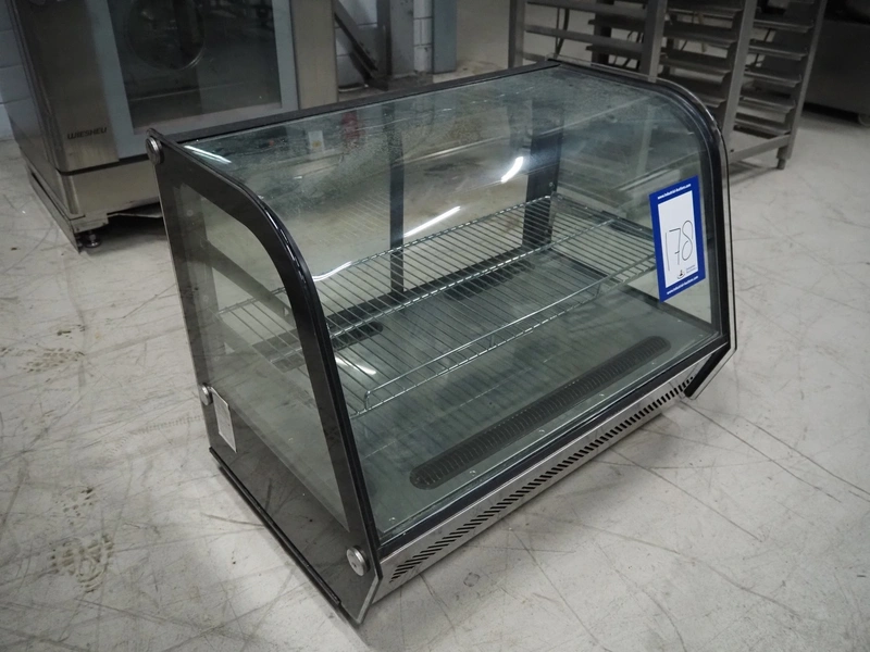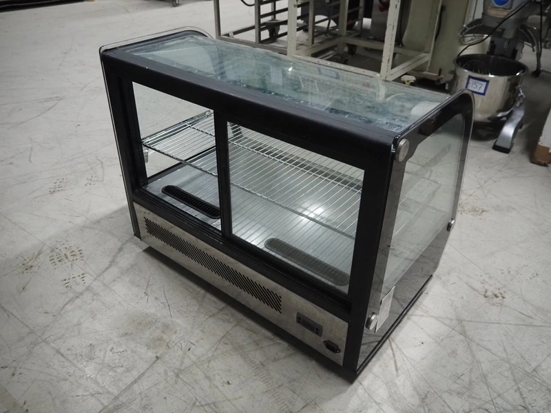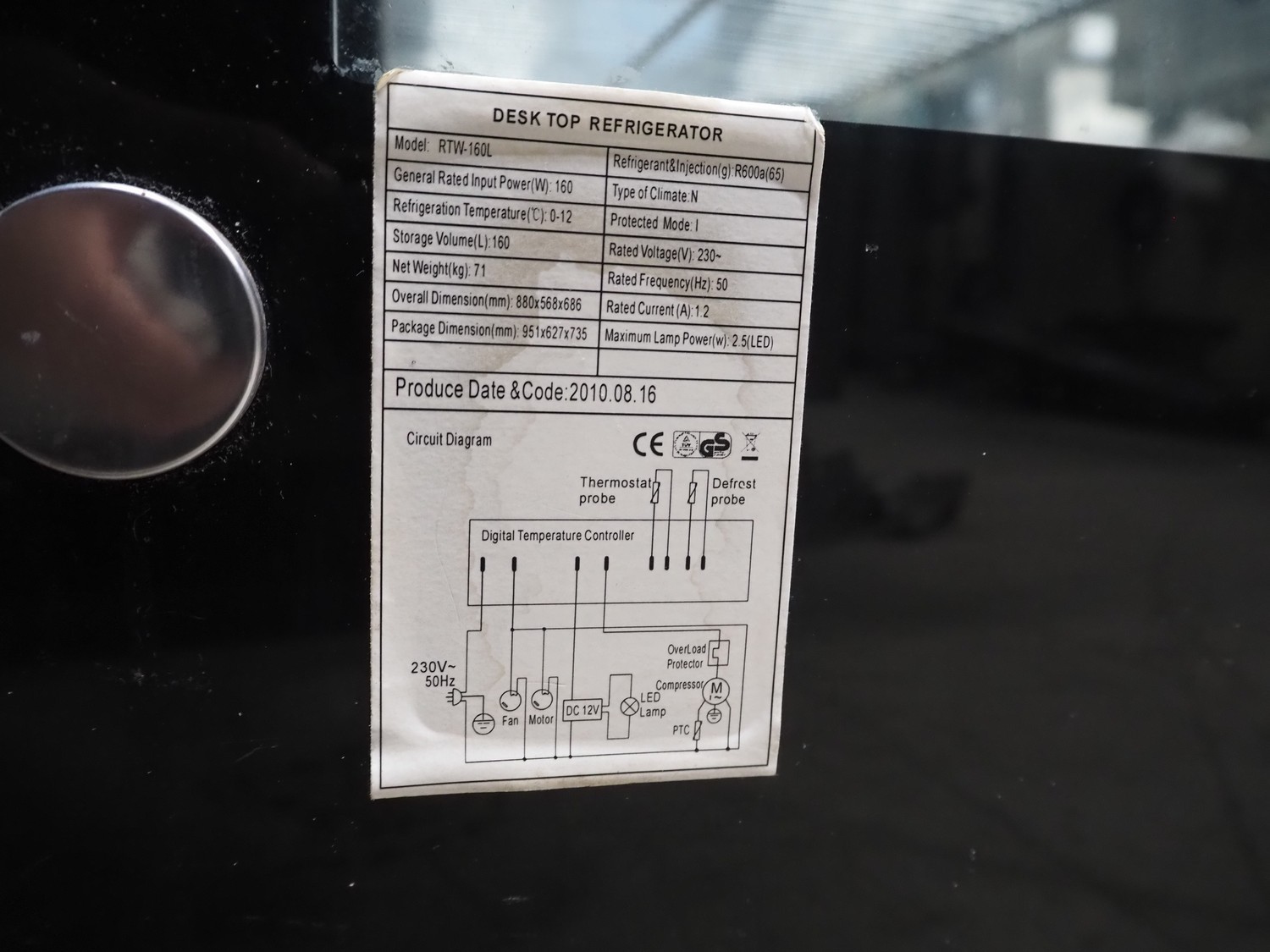 Refrigerated showcase, model: RTW-160L, year of construction: 2010-08-16, 230 V, 50 Hz, 1.2 A, 160 W, volume: 160 liter, weight: 71 kg, total dimensions: 900 mm x 560 mm x 700 mm.