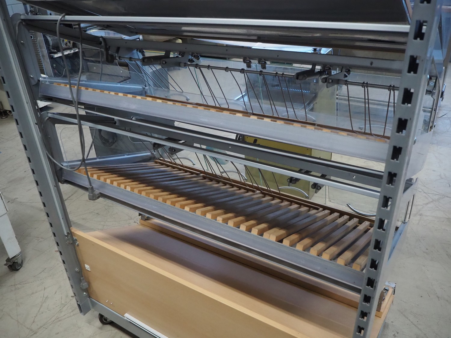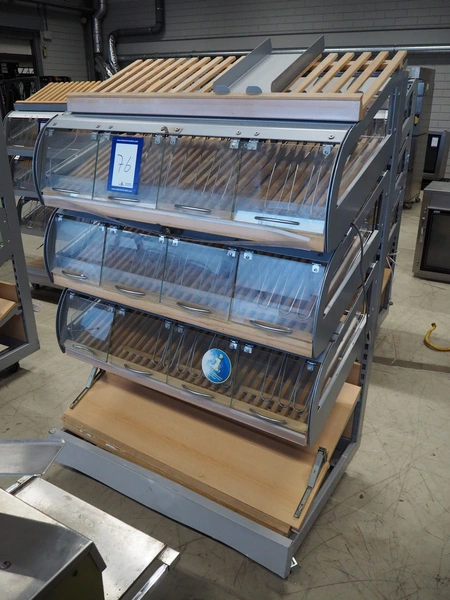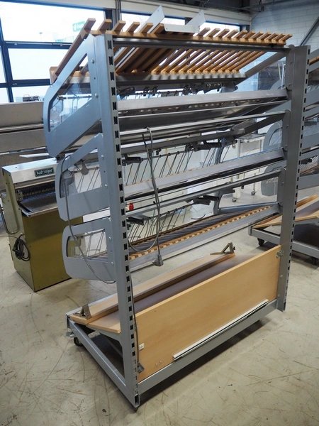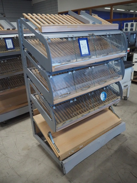 Mobile trolley for bread trays, dimensions: 1260 mm x 900 mm x 1820 mm. Without lights.