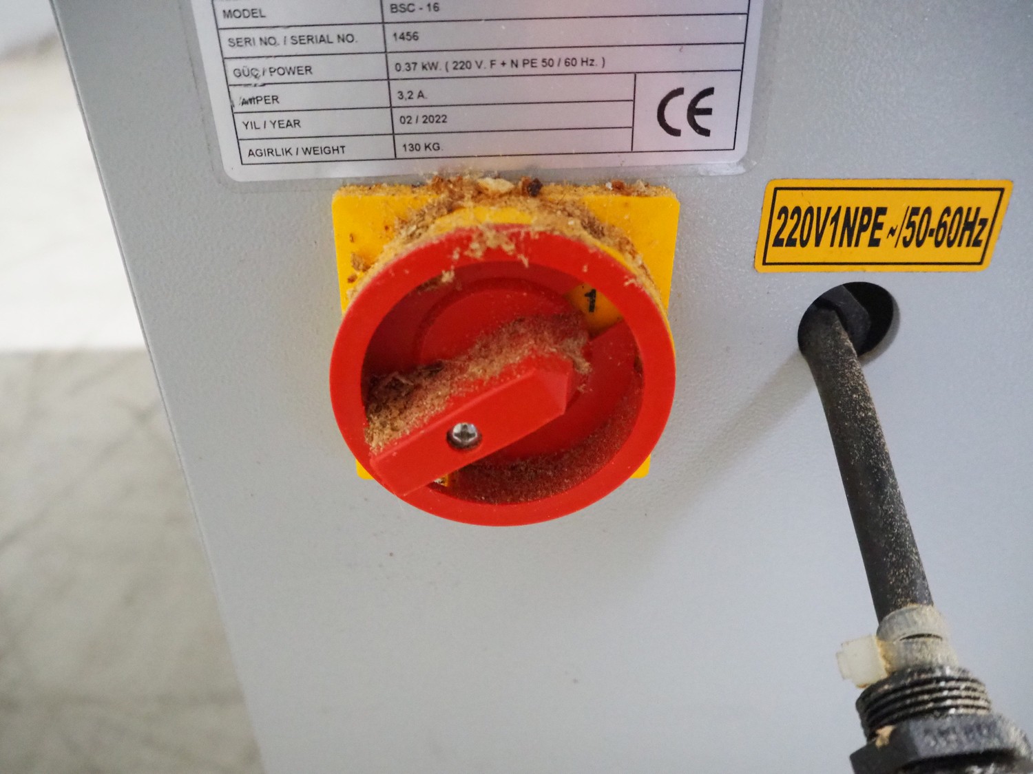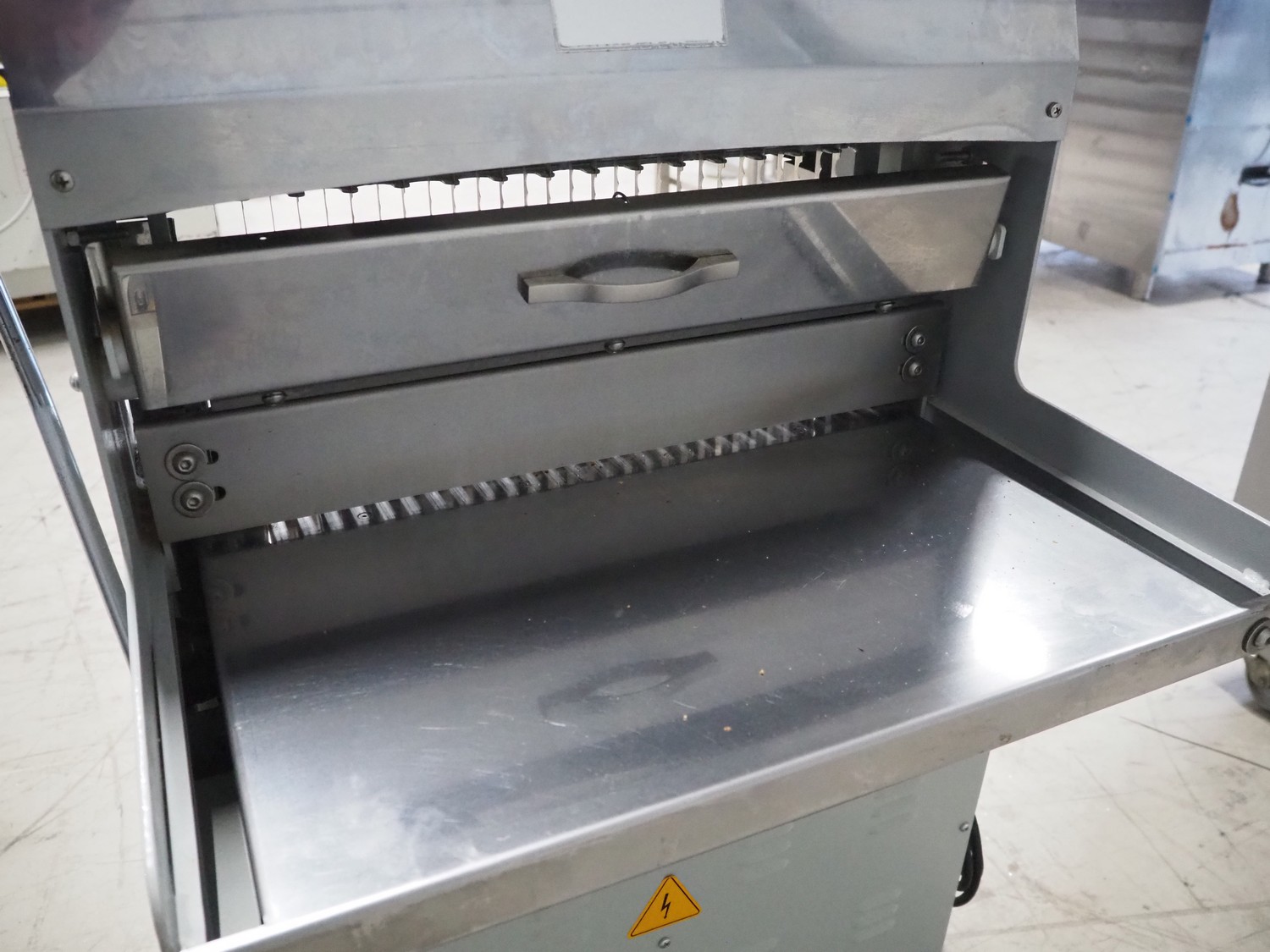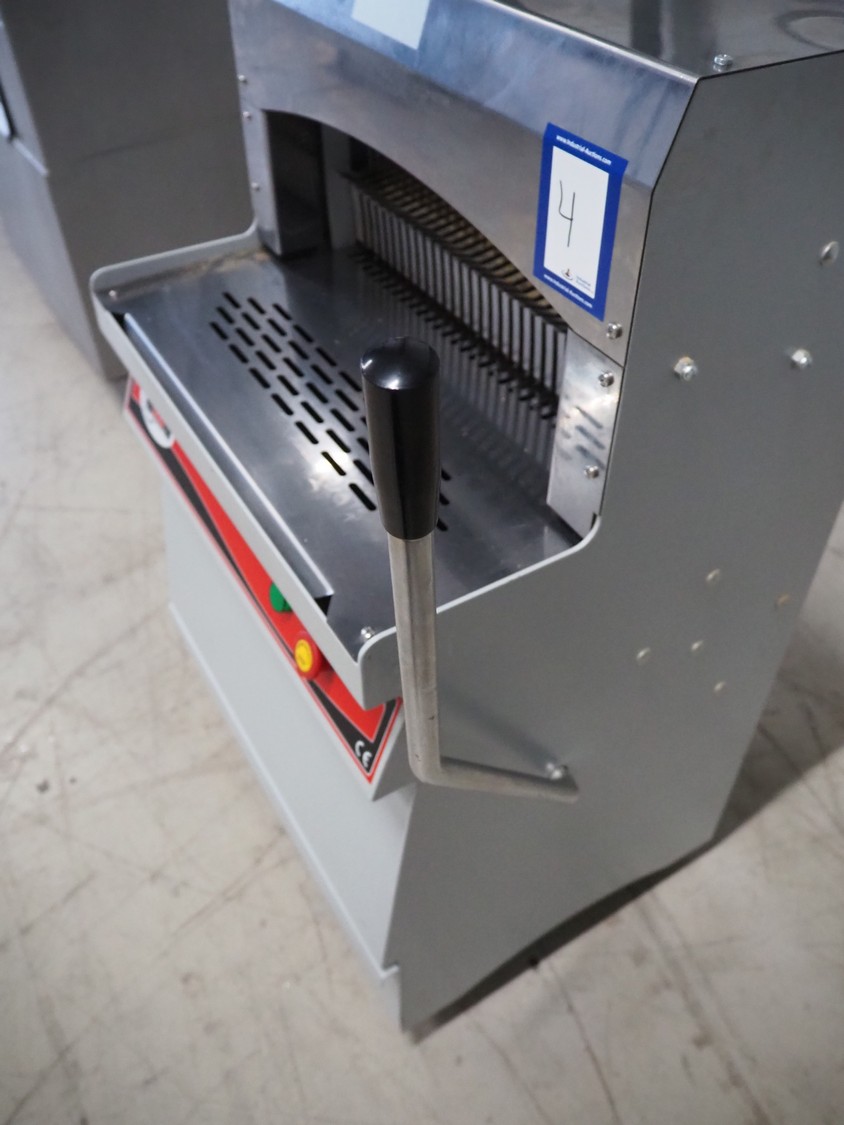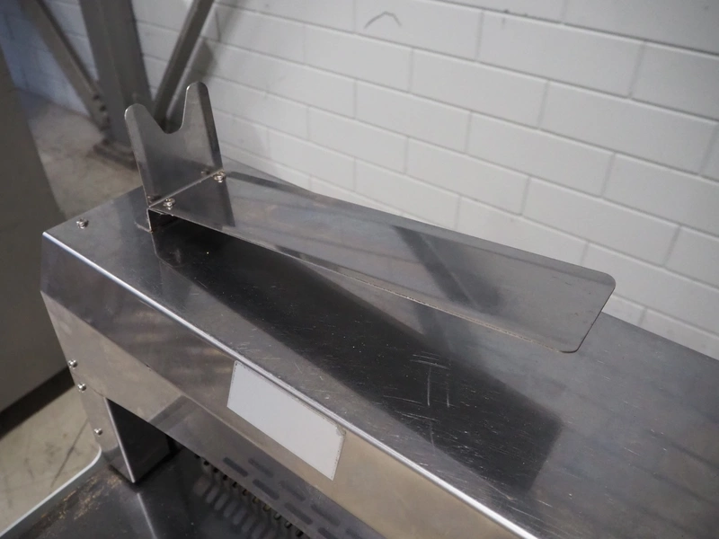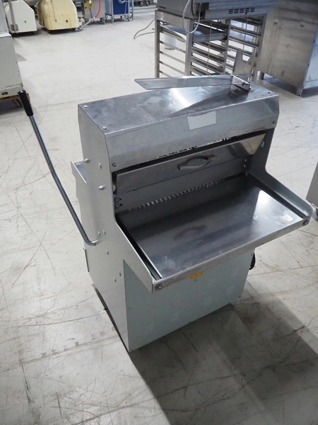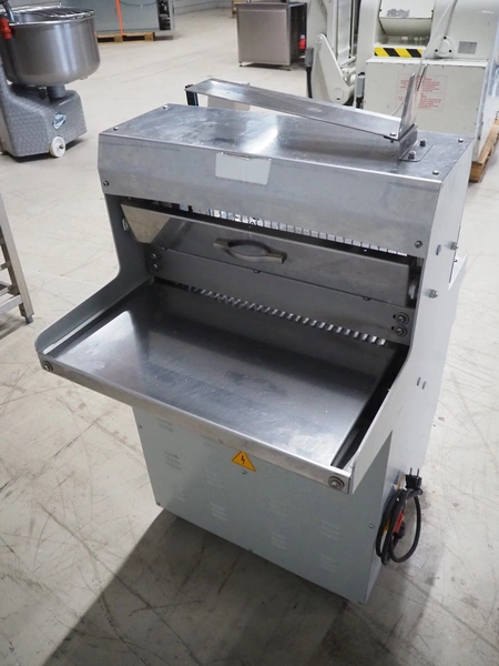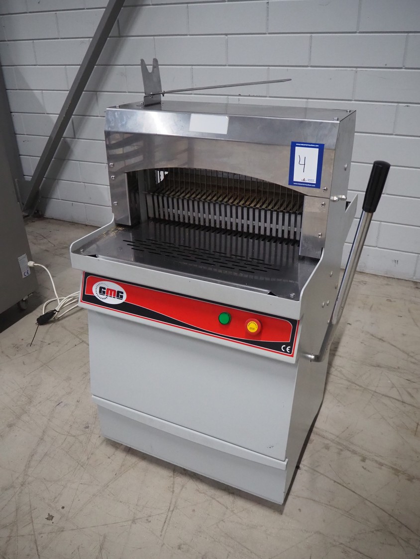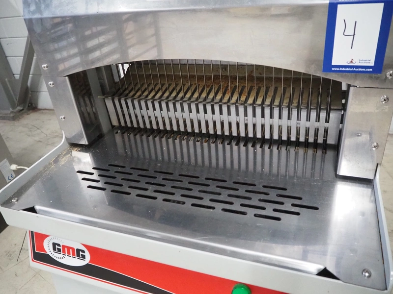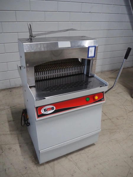 GMG bread slicer, model: BSC-16, serial number: 1456, year of construction: 02/2022, 220 V, 50/60 Hz, 3.2 A, 0.37 kW, weight: 130 kg, working width: 450 mm, total dimensions: 780 mm x 750 mm x 1040 mm.