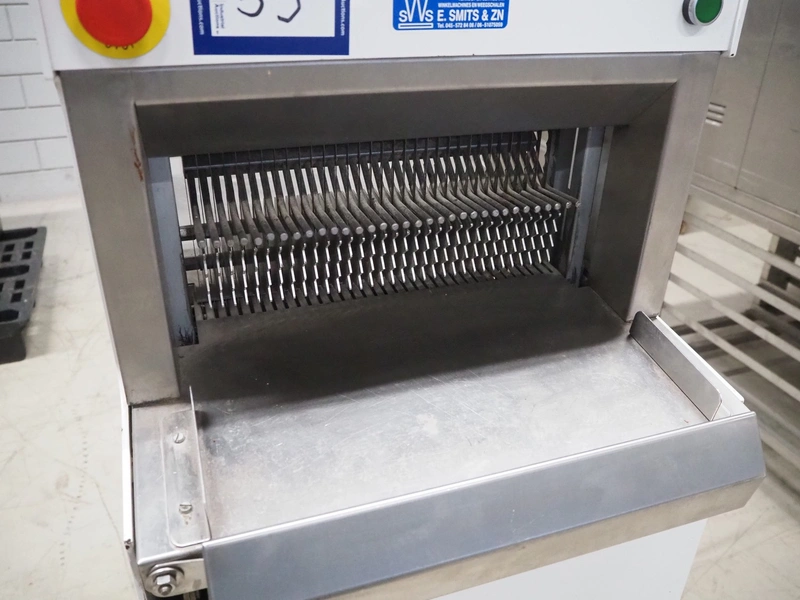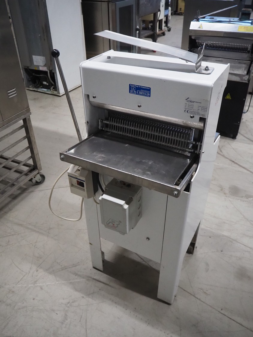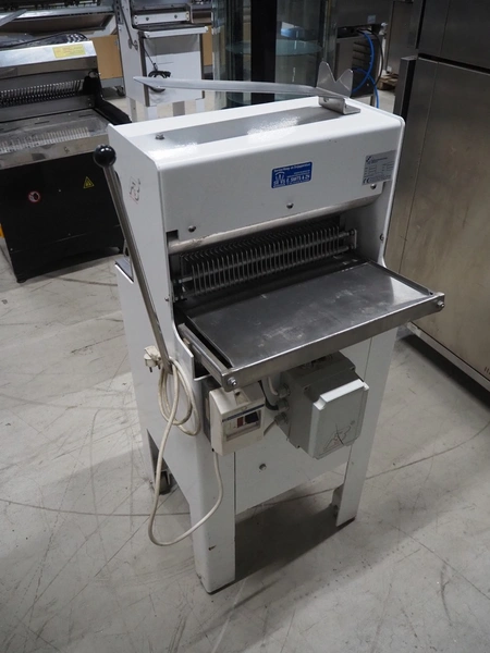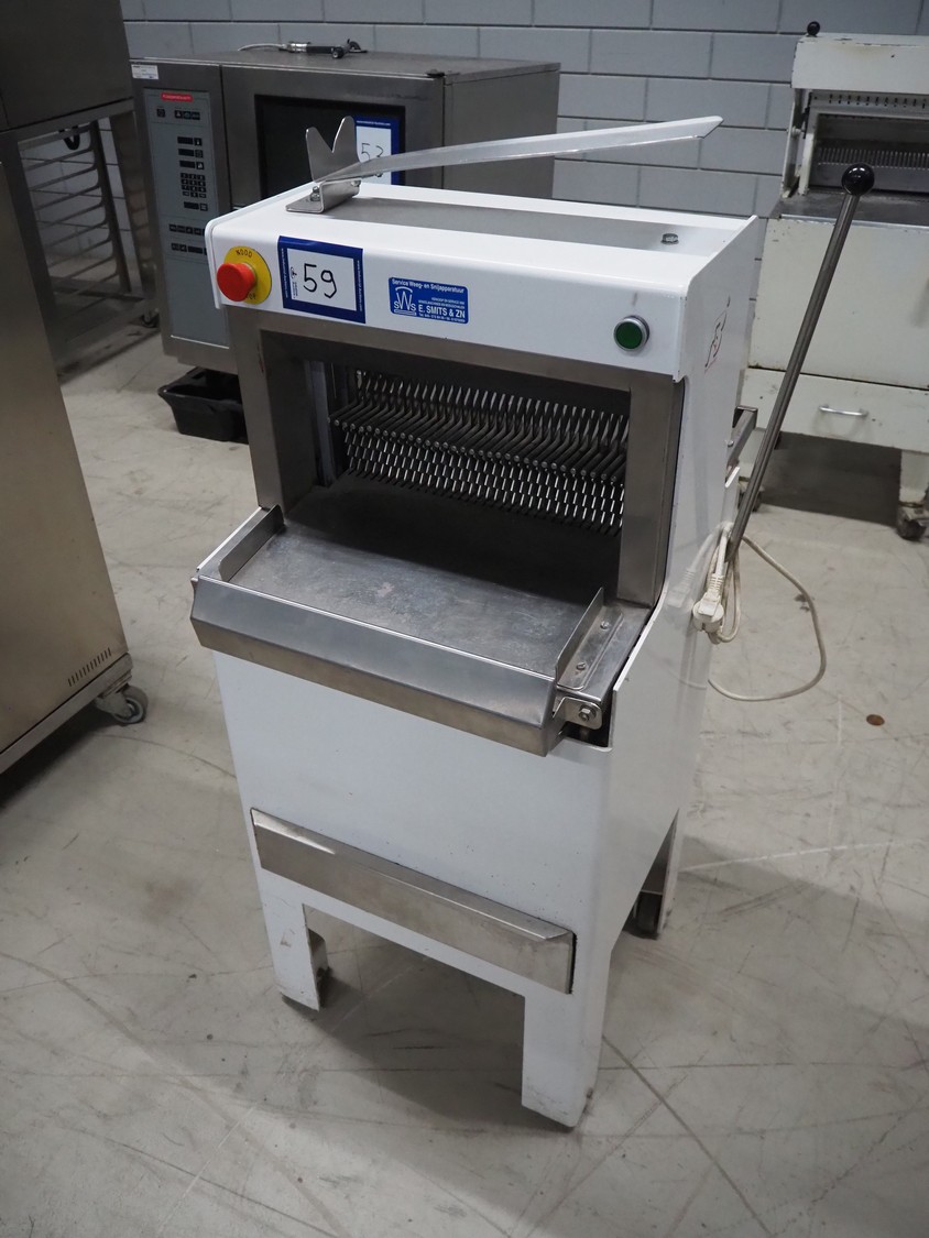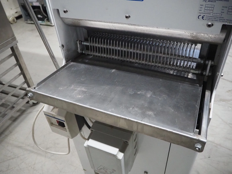 FB-broodsnijmachines Benelux bread slicer, type: A 11, machine number: 05320, year of construction: 2005, 230 V, 1 Ph, 50 Hz, 0.4 kW, working width: 385 mm, distance between knives: 10 mm, total dimensions: 550 mm x 660 mm x 1300 mm.