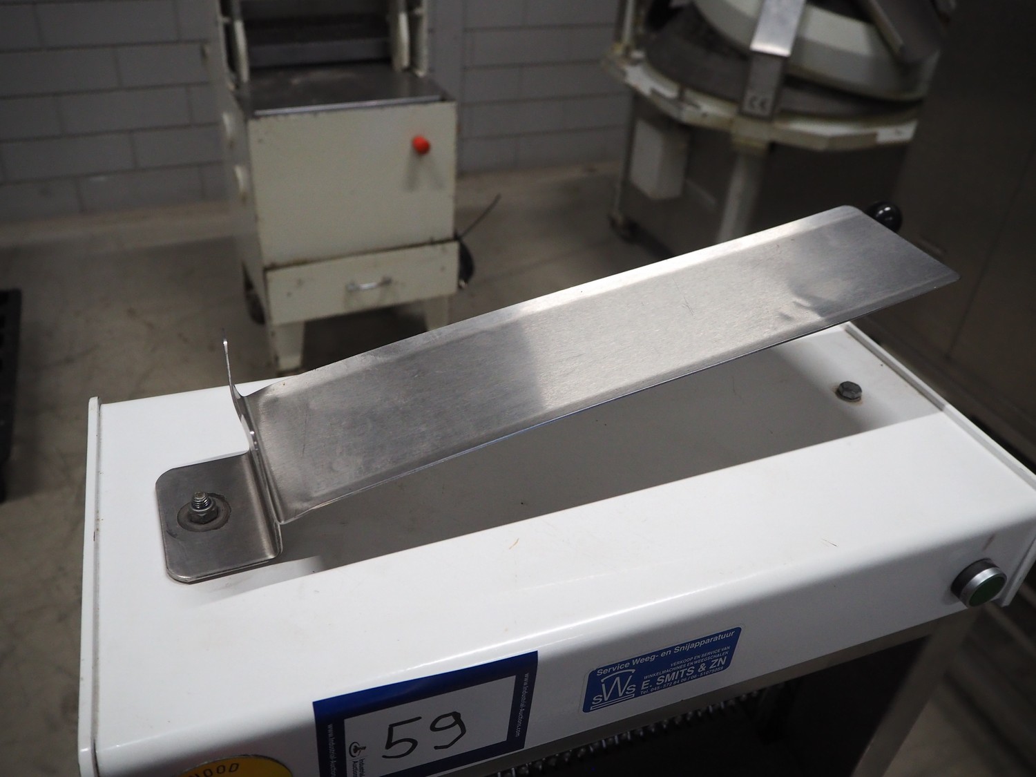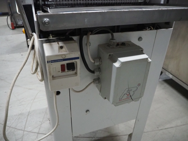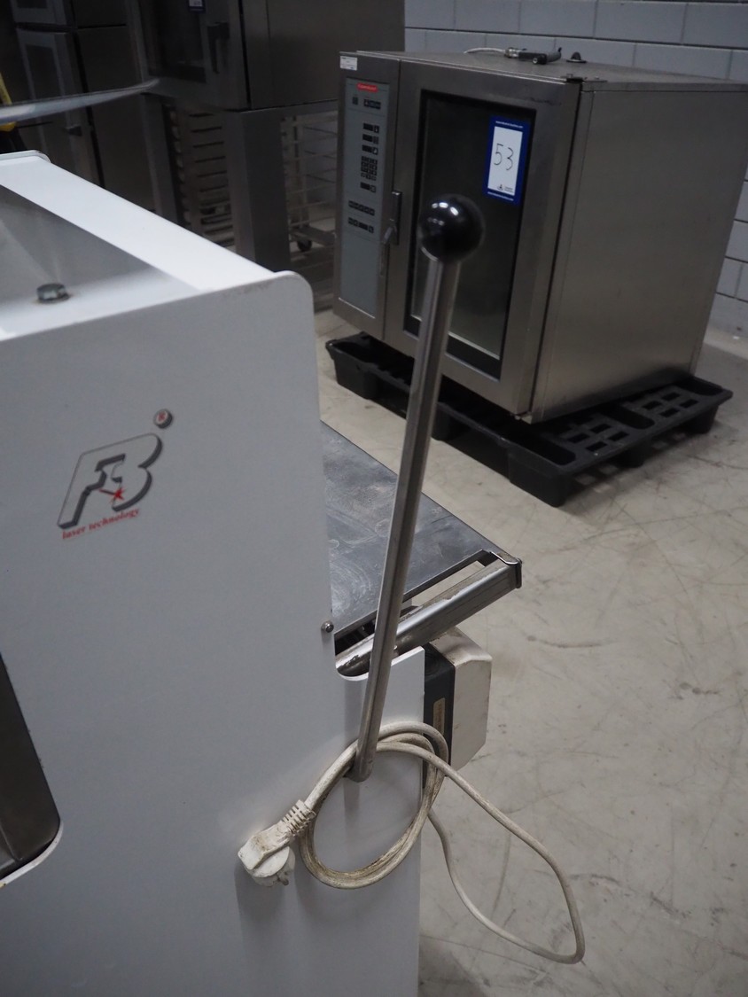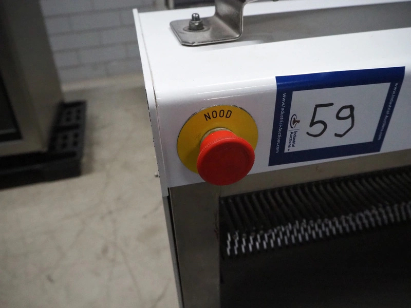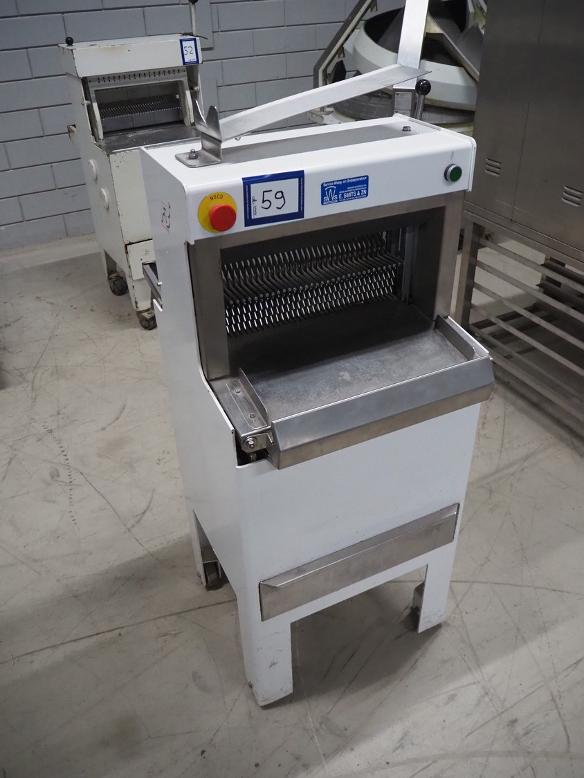 FB-broodsnijmachines Benelux bread slicer, type: A 11, machine number: 05320, year of construction: 2005, 230 V, 1 Ph, 50 Hz, 0.4 kW, working width: 385 mm, distance between knives: 10 mm, total dimensions: 550 mm x 660 mm x 1300 mm.