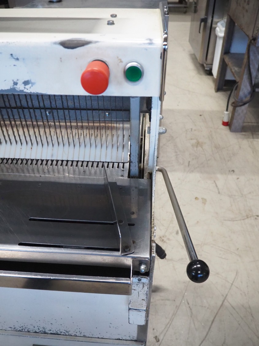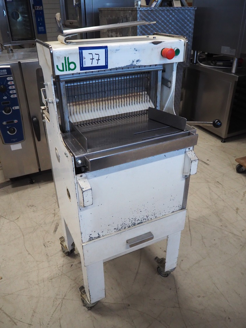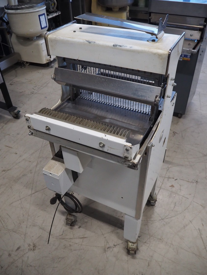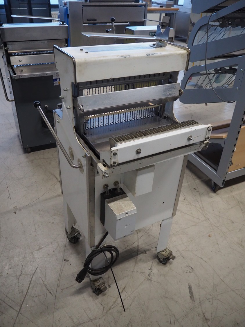 VLB mobile bread slicer, type: VL-40/12.5, number: 94NA043, 220 V, 1 Ph, 50 Hz, 30 knives, distance between knives: 12 mm, total dimensions: 650 mm x 600 mm x 1320 mm.
