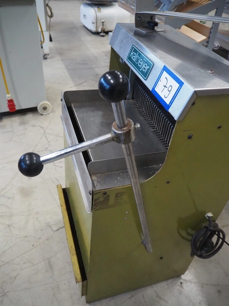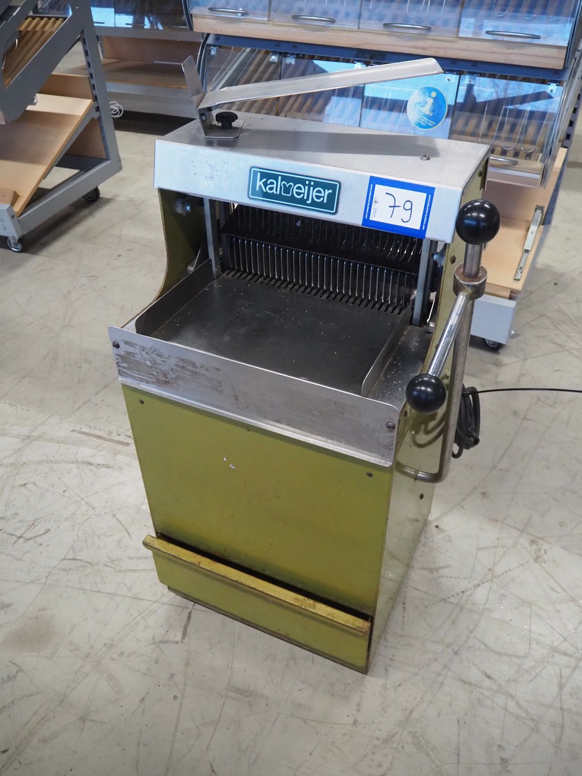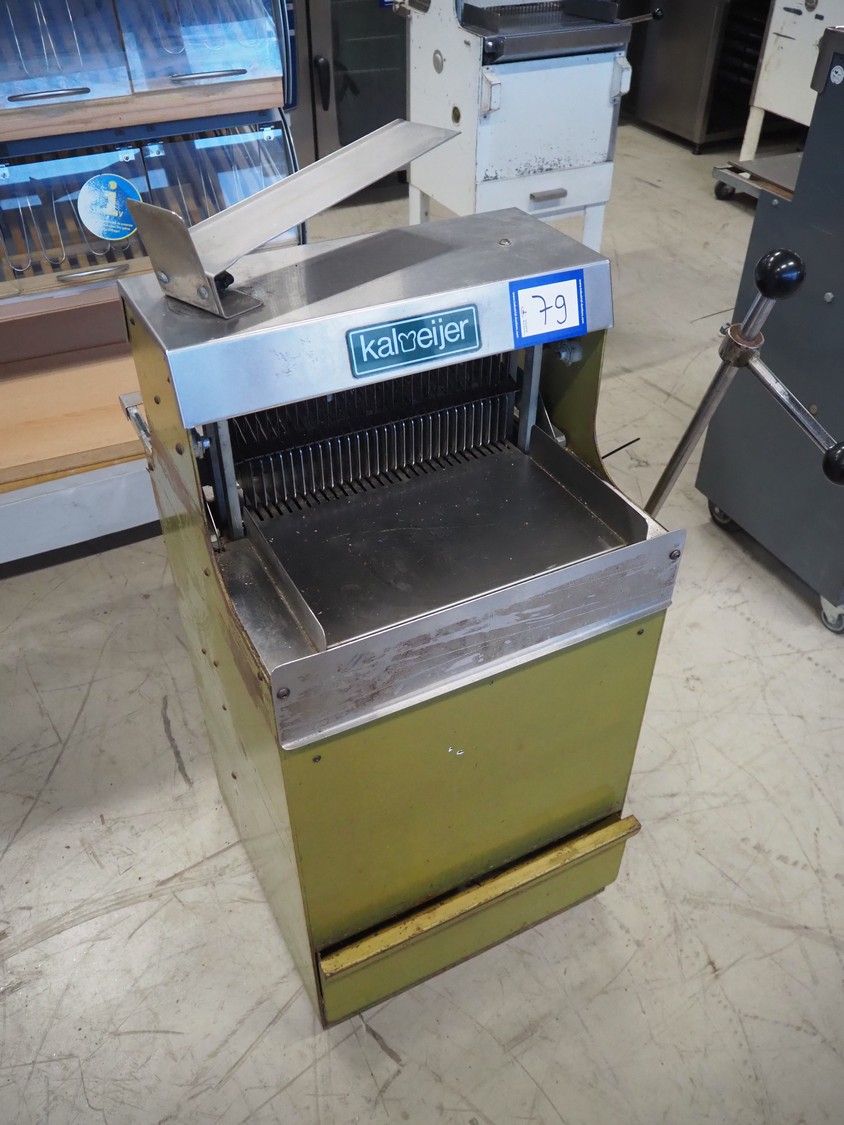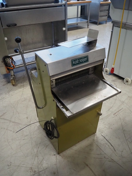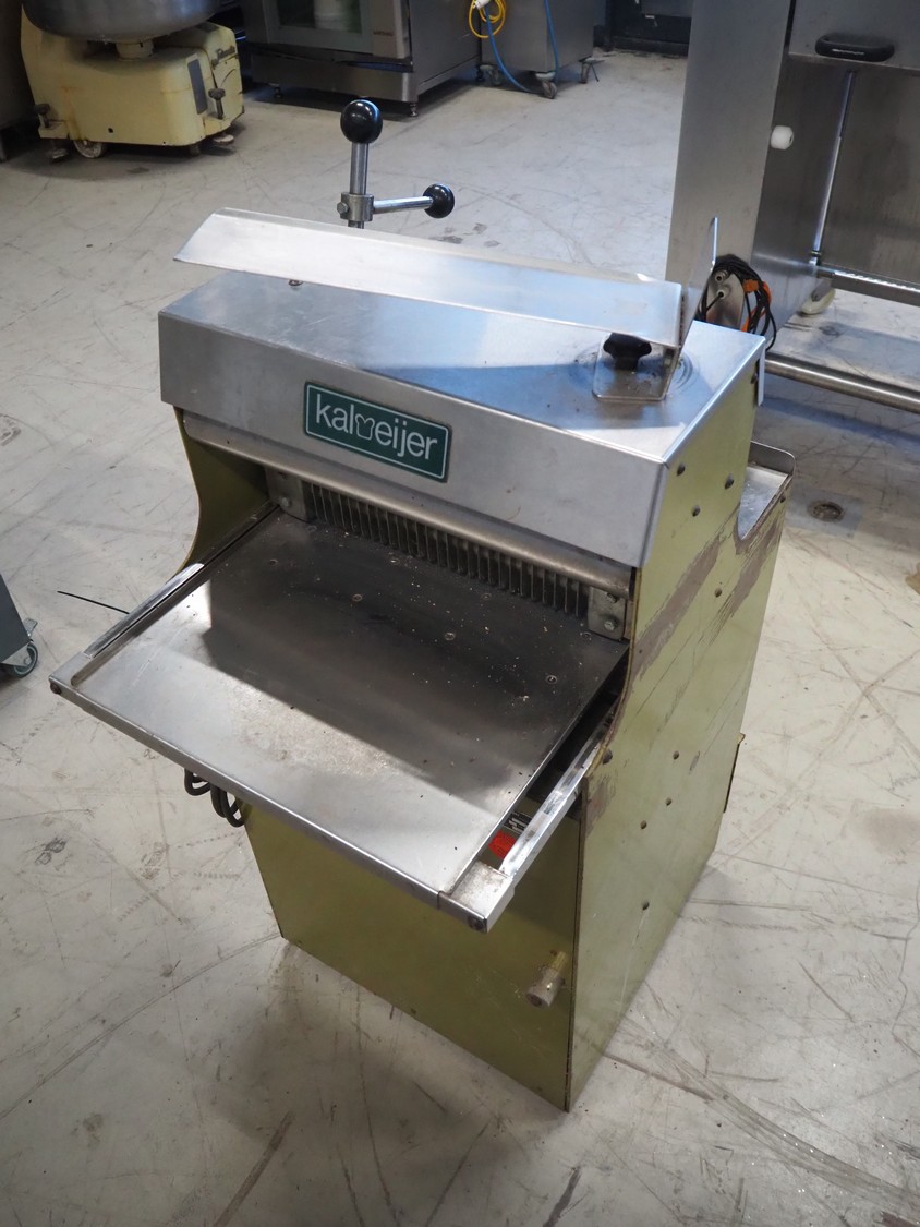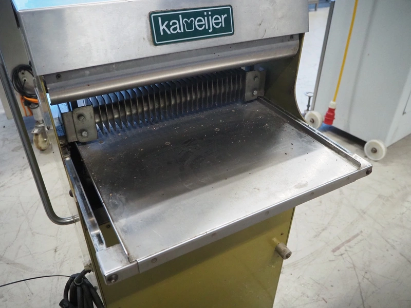 Kalmeijer bread slicer, 30 knives, distance between knives: 13 mm, total dimensions: 800 mm x 600 mm x 1170 mm.