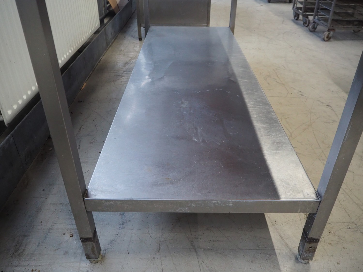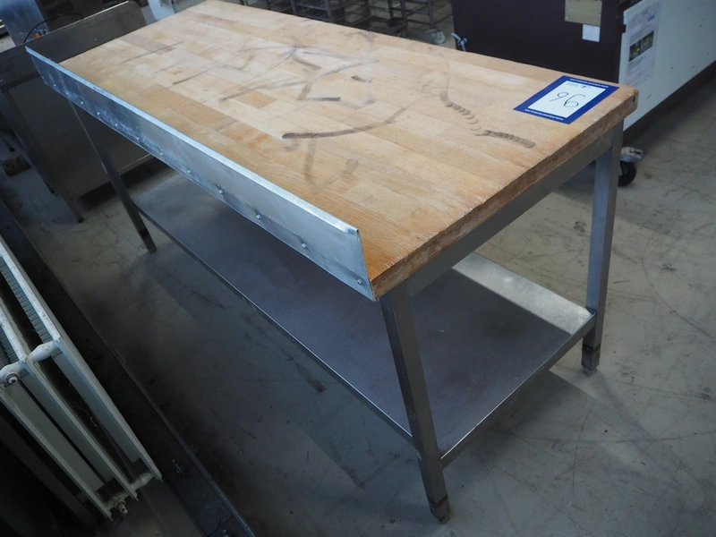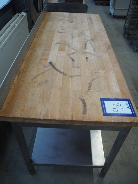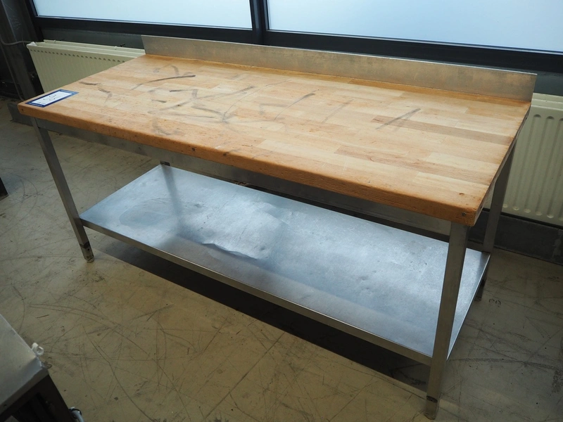 S/s table with wooden top, dimensions: 2000 mm x 800 mm x 940 mm.