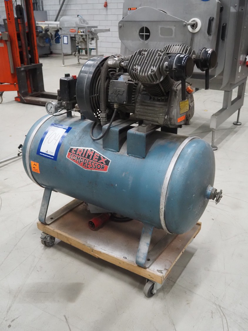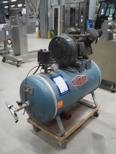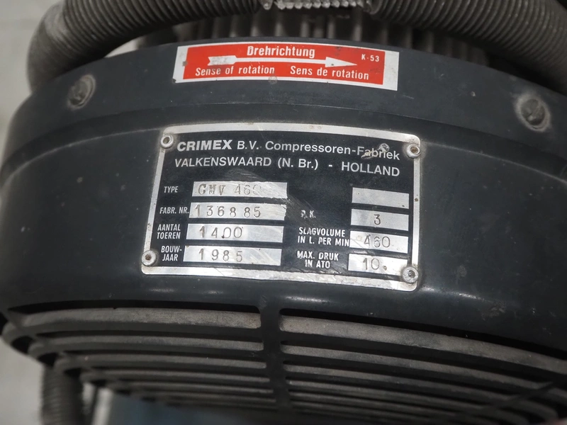 Crimex Compressor mobile air compressor, type: CMV 460, fabric number: 1368 85, year of construction: 1985, stroke volume in liter per minute: 460, max pressure: 10 bar, dimensions: 1300 mm x 500 mm x 1130 mm.