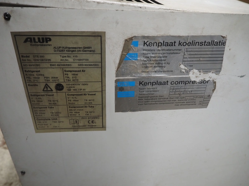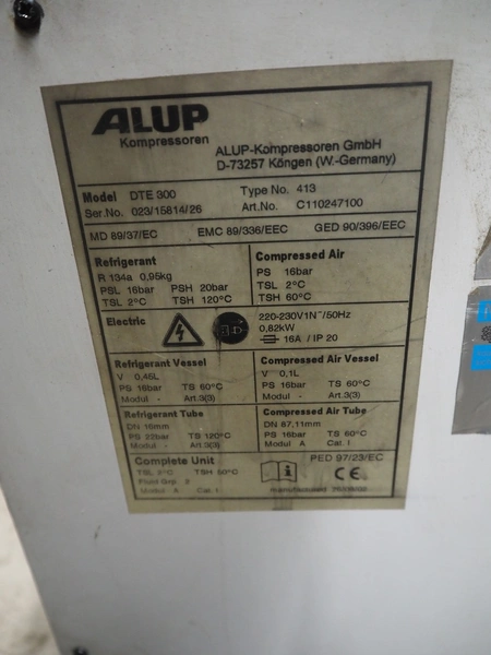 Alup-Kompressoren GmbH air-dryer, model: DTE 300, serial number: 023/15814/26, 220-230 V, 1 Ph, 50 Hz, 16 A, 0.82 kW, refrigerant: R134a 0.95 kg, dimensions: 600 mm x 600 mm x 910 mm.