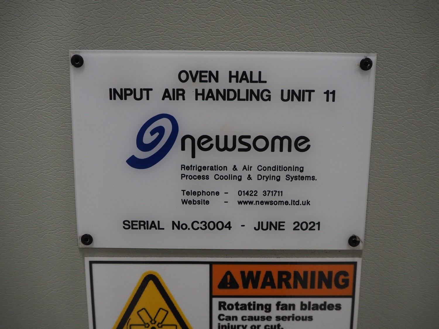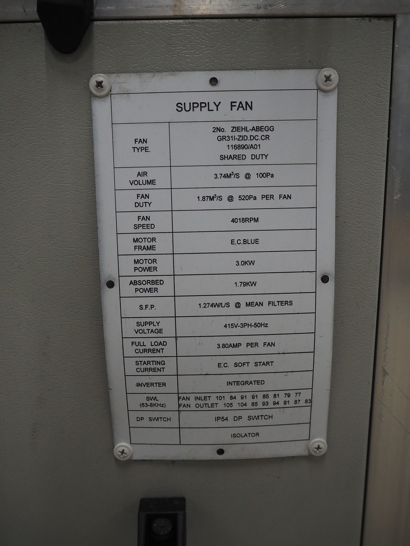 Newsome air handling unit, serial number: C3004, year of construction: 06/2021, 415 V, 3 Ph, 50 Hz, 3.80 A, 3.0/1.79 kW, 4018 rpm, dimensions: 1500 mm x 1200 mm x 2400 mm.